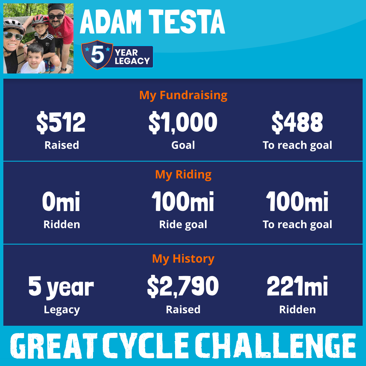 This September, I am taking part in my 5th year of the Great Cycle Challenge to fight kids' cancer! I appreciate all of those who have helped along the way. This year I set another goal of 100 miles to hopefully reach and surpass.