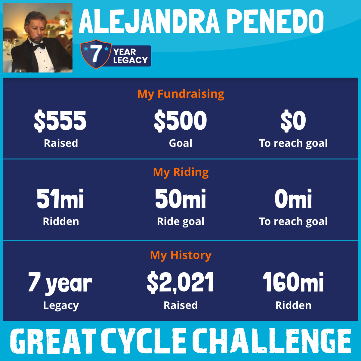 I am riding in honor of my dad, Luis A. Penedo, who battled cancer from the age of 5 to 12. He lived his life with gratitude and kindness, always striving to be a good person to everyone around him. After 50 beautiful years of health, God called him home, leaving us with cherished memories. In the 10 years since his departure, my mission has been to help more children have the same opportunity for a full and happy life as my dad did. I am raising funds through my challenge to help these kids and support the Children's Cancer Research Fund. Your donation will allow them to continue their work to develop lifesaving treatments and find a cure for childhood cancer. Please support me by making a donation to give these kids the brighter futures they deserve. Your support will change little lives. Thank you. 🌟 Alejandra