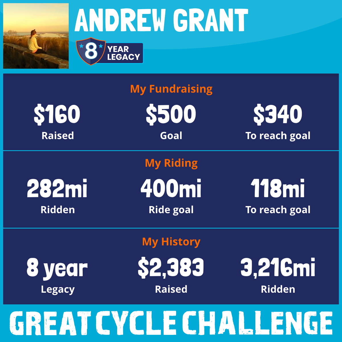 I am riding 400 mi in memory of Sean. Please sponsor me and support my challenge to fight kids' cancer and save little lives.