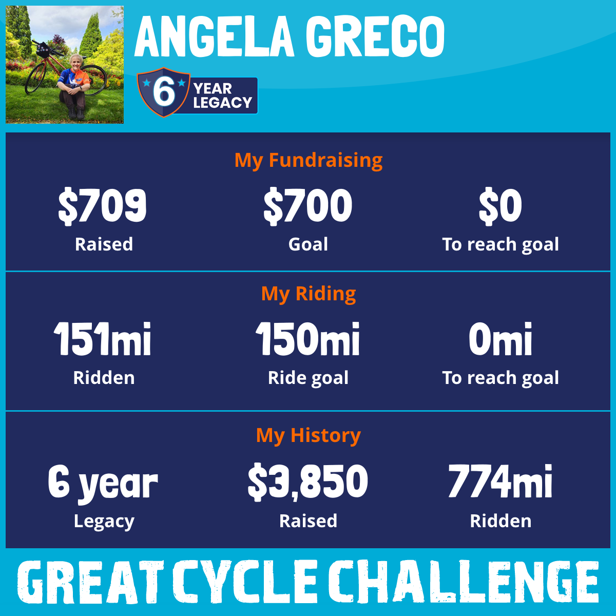 This is my 5th year participating in the Great Cycle Challenge. As the years continue, this event has become more and more important to me for many reasons. It is a cause that is close to my heart and continues to inspire me in ways I can't predict. It breaks my heart that anyone, especially children, has to go through fighting cancer when they should be living life and looking forward to their future! Finding a cure is so very important when this disease is impacting so many people and families!
