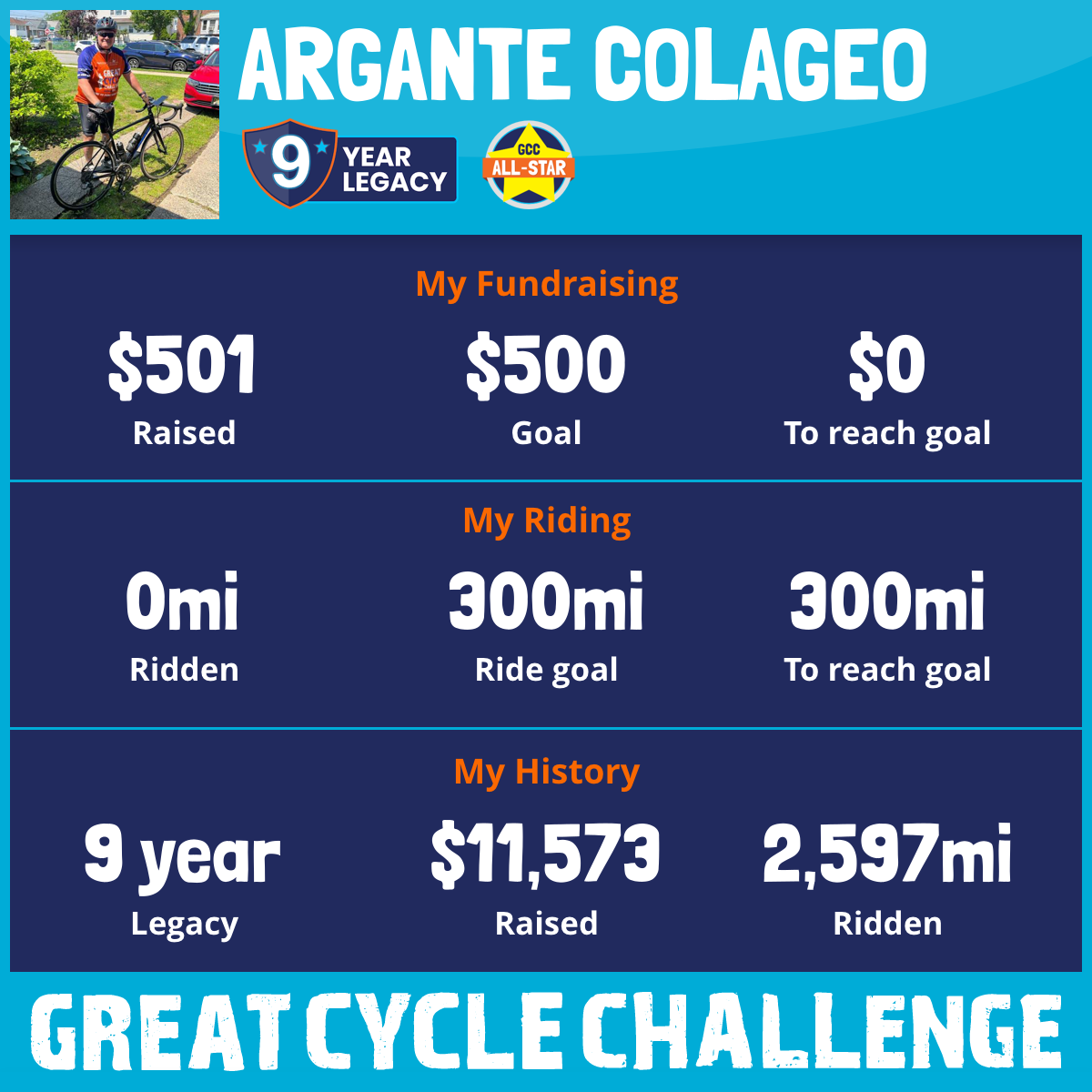 This is my fifth year in the Great Cycle Challenge to fight kids cancer. I will be riding at least 500 miles (805 km) this September to raise funds to continue the fight. I hope you will join me in this effort and make a donation of whatever amount you can. Every donation, no matter how much it is, helps.