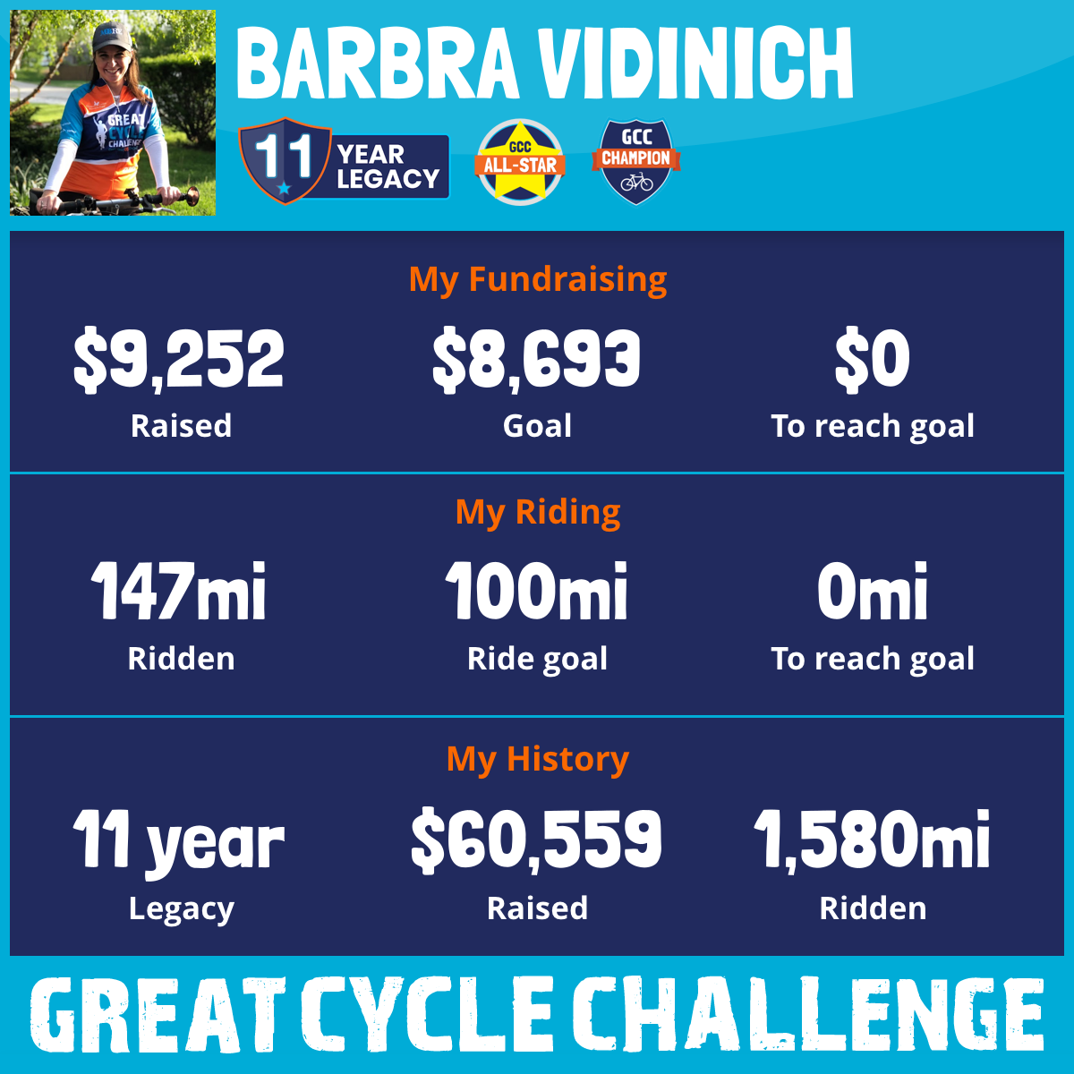 Our Challenge - to work together to fight cancer! Will you please join our team either as a cyclist or by making a donation? My goal is to raise $8,693 for the Children’s Cancer Research Fund (CCRF) in support of its 11th annual Great Cycle Challenge USA and I pledge to you, that I will ride 100 miles throughout the month of September.