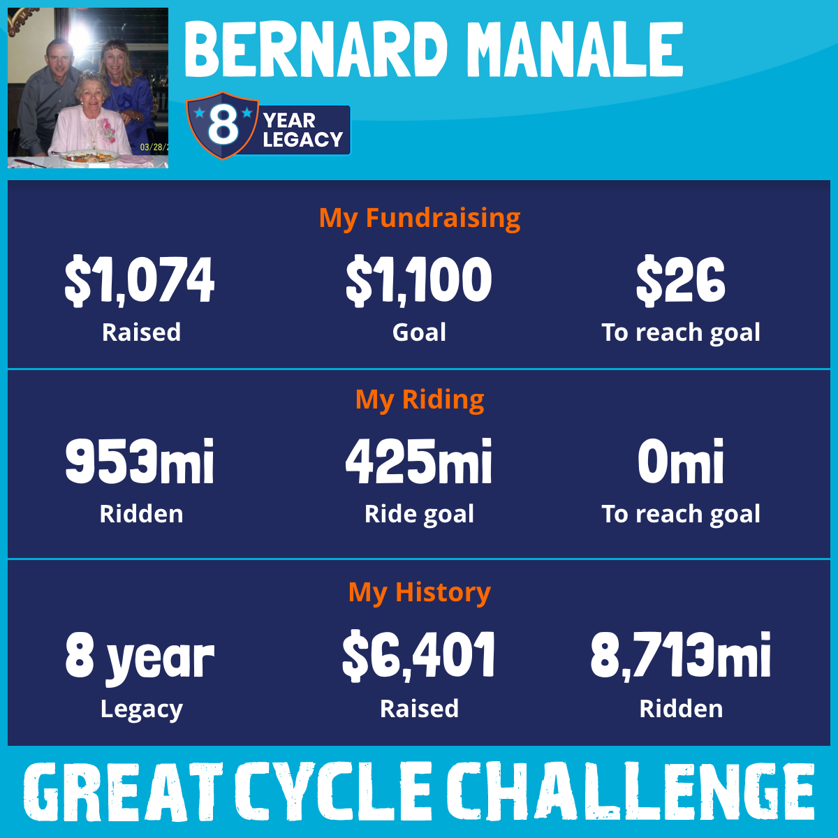 I am riding 425 mi in memory of Cindy Manale McGlone Miller. Please sponsor me and support my challenge to fight kids' cancer and save little lives.