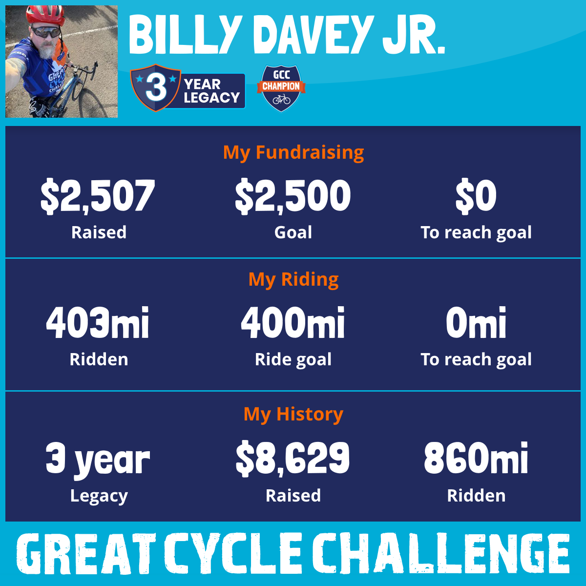 * A Personal Challenge: Last year, your support was overwhelming, and it drove me to push my limits. This year, I'm not just cycling for the miles, but for every child who's fighting a battle they shouldn't have to. I've set a goal to raise $2,500, and if I reach this, I'll double my mileage to 400 miles, pushing myself beyond what I thought possible.