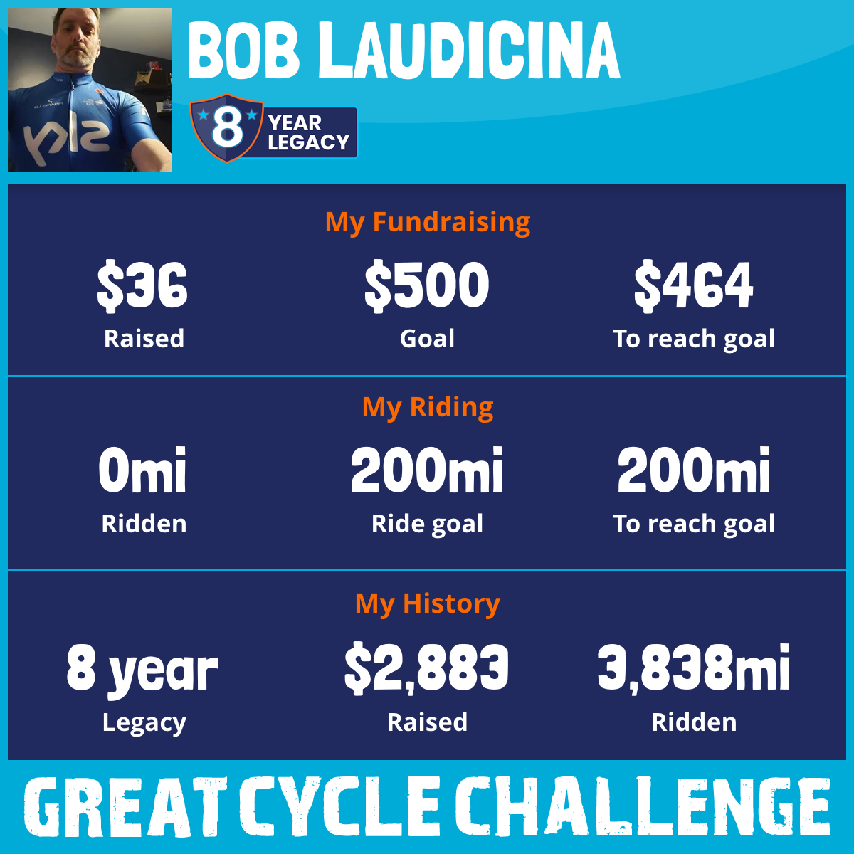 I am riding 200 mi for Bob. Please sponsor me and support my challenge to fight kids' cancer and save little lives.