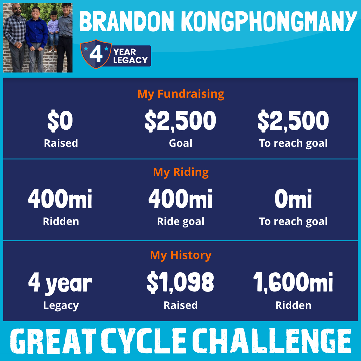 I am riding 400 mi in memory of my cousin, Cainen Sengsourivong. Please sponsor me and support my challenge to fight kids' cancer and save little lives.