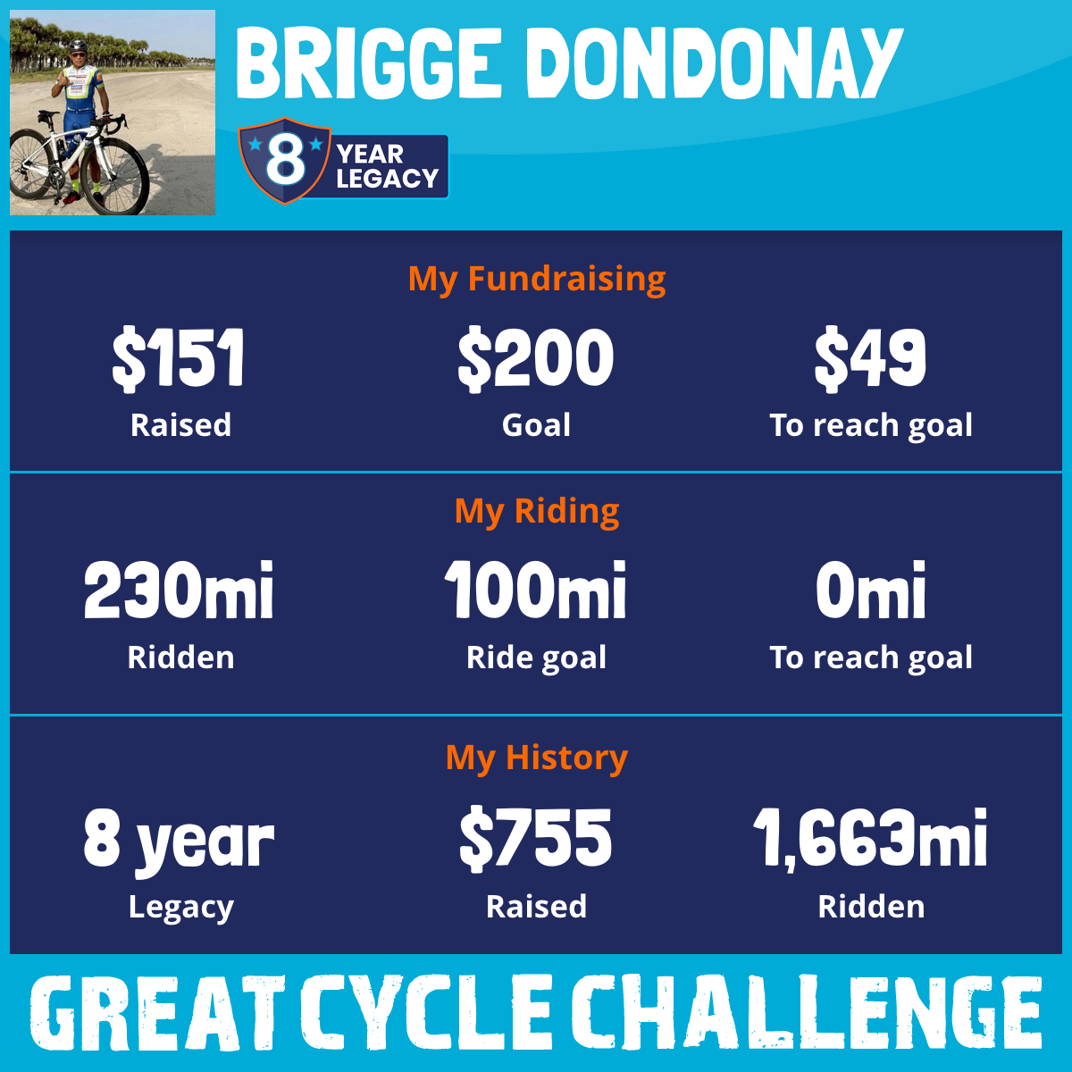 I am riding 100 mi in memory of Bing Dondonay. Please sponsor me and support my challenge to fight kids' cancer and save little lives.