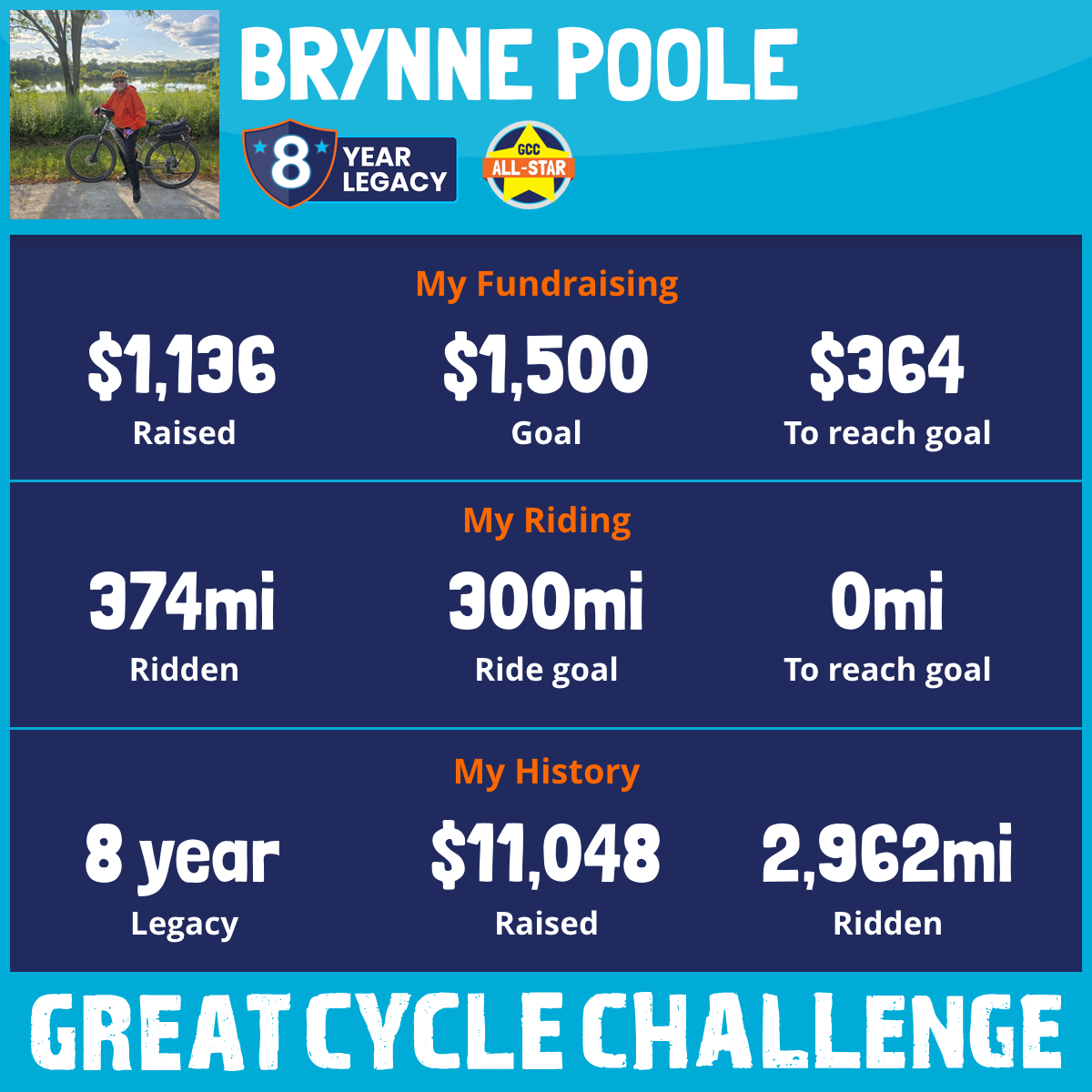 This September, I am taking part in the Great Cycle Challenge to fight kids' cancer! This is my 9th year!