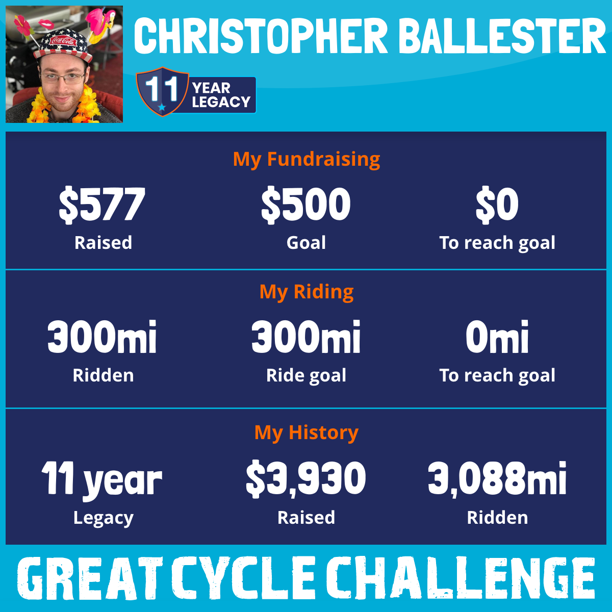 I am riding 300 mi for My future brother in law, and Jean Ballester. Please sponsor me and support my challenge to fight kids' cancer and save little lives.