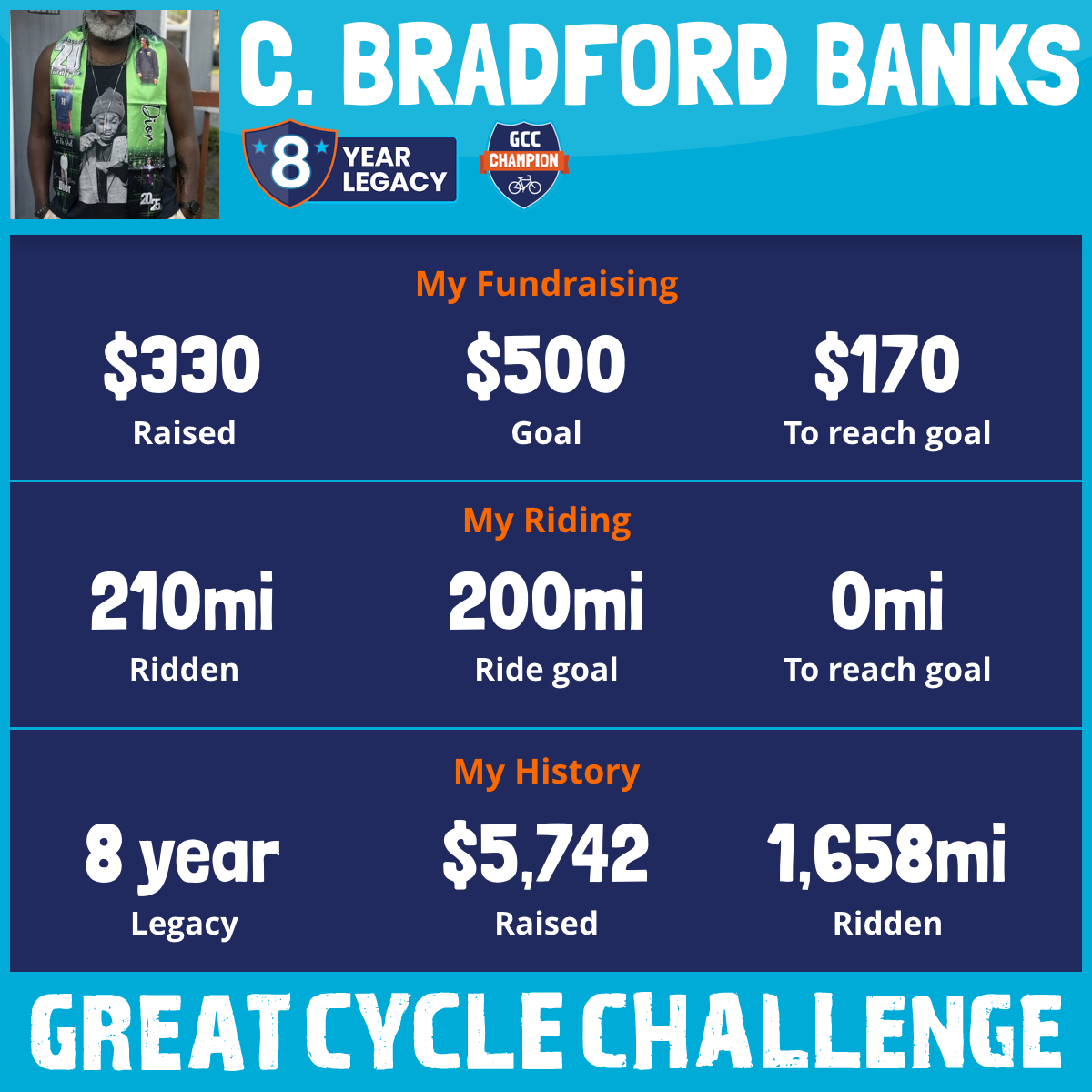 My mother Hildret was first diagnosed with cancer when I was a much younger boy. At that age I didn't understand what was going on, only that mommy was sick in the hospital. Through grace, modern medicine and time she pulled through. Fast-forward 35 years later it returned this past November. Mom tried to fight the good fight but her body was weak and tired from the 75+ years on the earth. So this year I am riding for my mother Hildret Lee Banks
