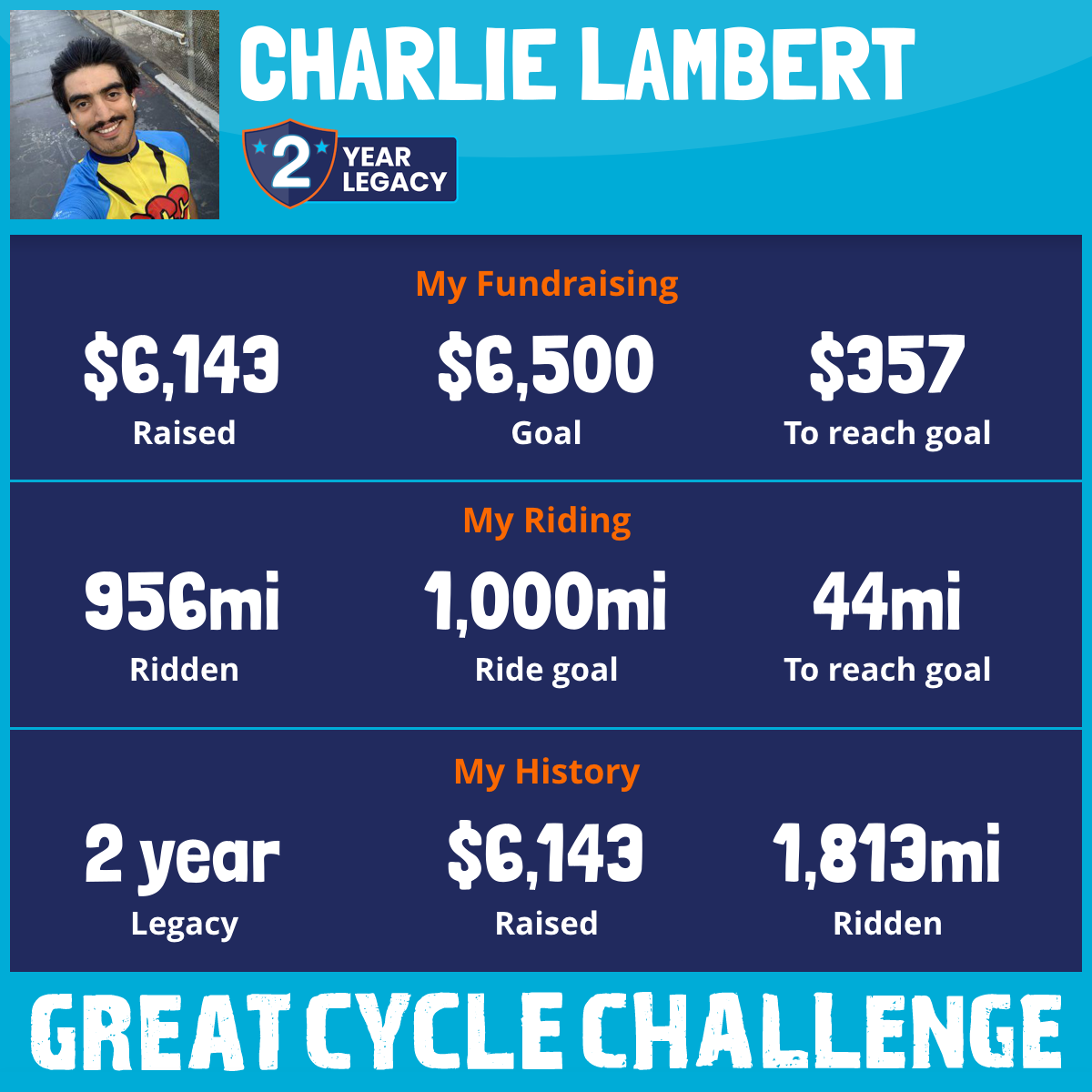 This September, I'm taking on the Great Cycle Challenge - to fight childhood cancer. I will move with a purpose and pledge to ride 500 miles to raise $2,500 to fund research for childhood cancers.