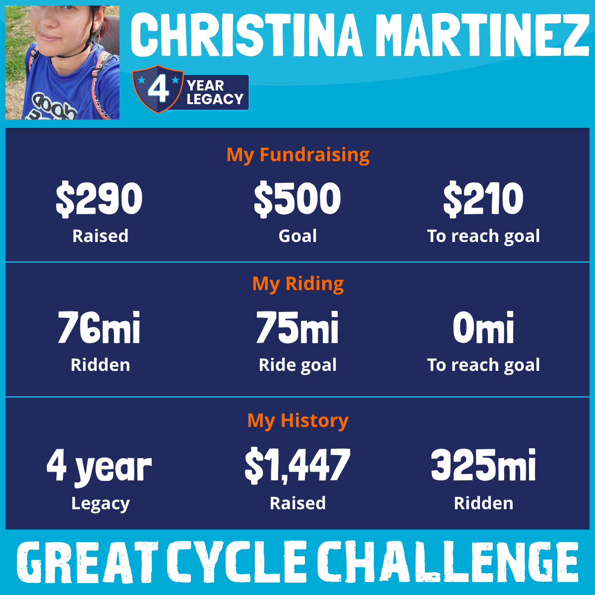 A close friend of mine began this challenge last year. She is a selfless person who is always finding ways to help others. In her kindness, she has inspired me to combine my love for bike riding with a worthy cause of helping children fight cancer.