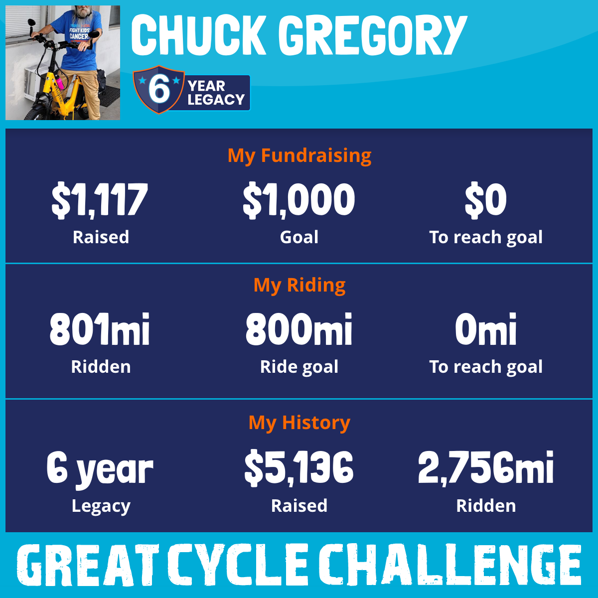 This September, for the sixth year in a row, I am taking part in the Great Cycle Challenge to fight kids' cancer! I'm going to ride at least 800 miles (I do have electric assist, but I'm no spring chicken) and I have set a fundraising goal of $1000.