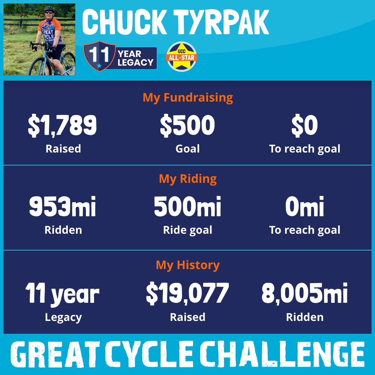 This September, I am taking part in the Great Cycle Challenge to fight kids' cancer! This will be my 11th year, and I plan on reaching over 500 miles by the end of the month for this very worthy cause.