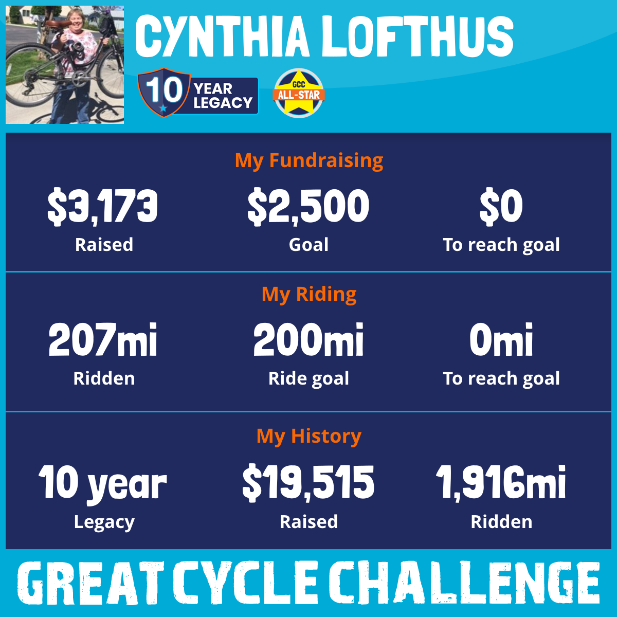 So I am raising funds through my challenge to help these kids and support Children's Cancer Research Fund to allow them to continue their work to develop lifesaving treatments and find a cure for childhood cancer. I've raised a lot more money by riding and asking for donations than I possibly could by donating as an individual.