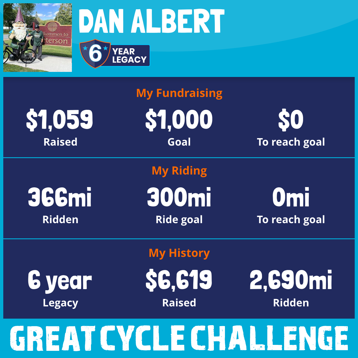 This year will be my 6th year participating in the Great Cycle Challenge. I am riding for my Father-in-Law Richard Kruzel, Uncles Roger and Gordie, family friends Carissa Blanchard, Sarah Etelman, and sadly this year Christine Gabriel. All of these dear people passed away due to cancer. One of the true survivors is Joshua Abbott and Anne Link who overcame brain cancer!! For those who have passed, may you all rest in peace. I do this in loving honor and memory of all of you! Joshua Abbott and Anne Link , keep up the great fight!!! You are truly inspiring!!! I am dedicating this year's effort to my late wife, Lana Albert, who battled PKD Kidney failure valiantly for 15 years who passed away on May 10th, 2025.