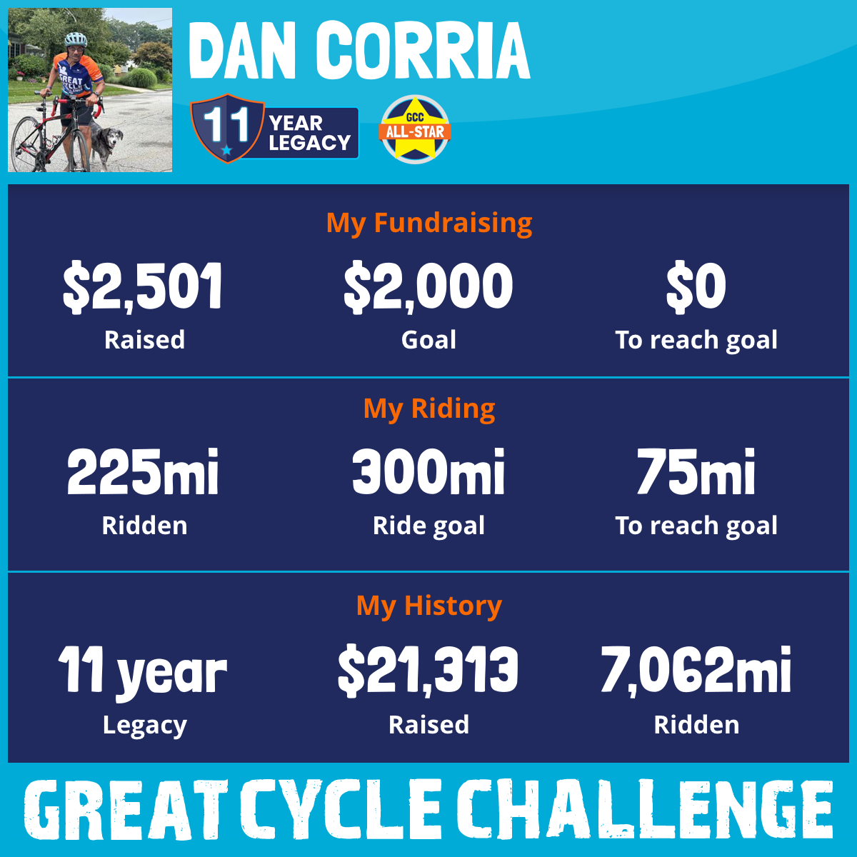 The Great Cycle Challenge has been completed. We raised.over $2500, but I wasnβt able to finished my pledge of riding of 300 miles. During the last week of September, I came down with covid. As soon as I have recovered, I will complete my 300 miles!