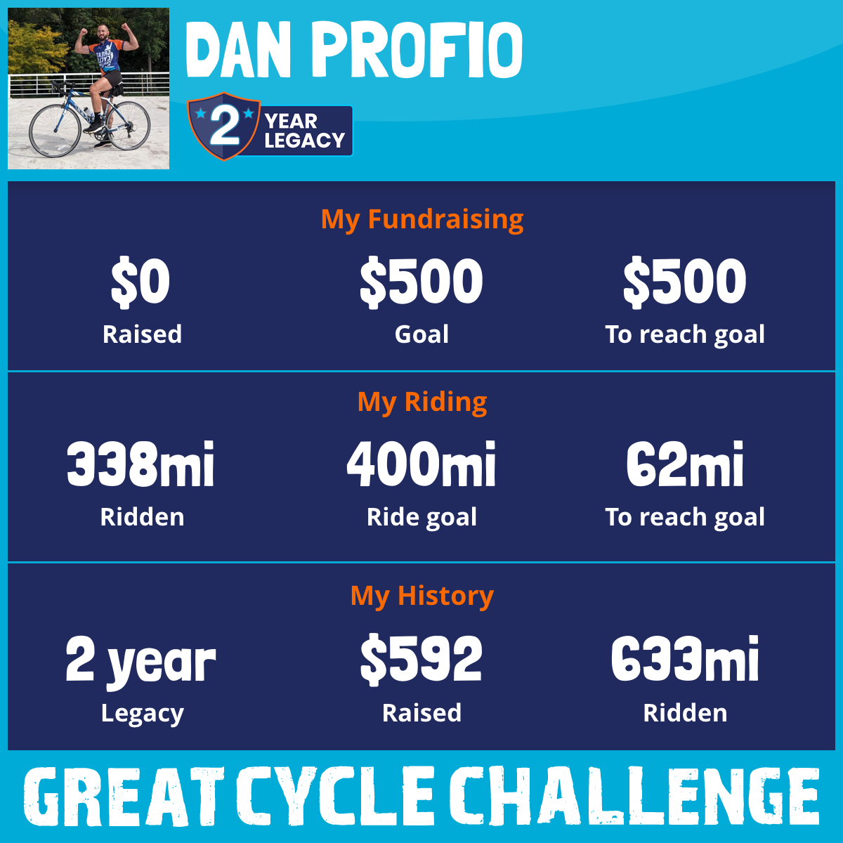 Hello, my name is Dan, and I live in Milwaukee, Wisconsin. I've been passionate about riding my bike since I was a kid, and it has always been a significant part of my life. Just this month (July), I biked 200 miles to prepare for the upcoming Great Cycle Challenge in September. I wanted to prove to myself that I could do it again for a cause that inspired me.