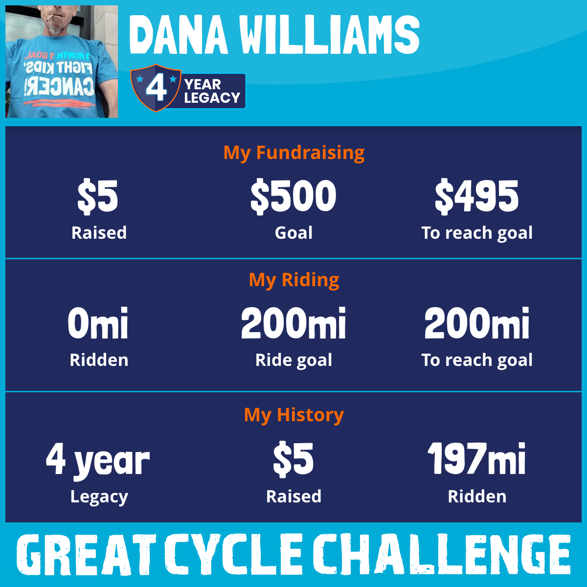 I am riding 200 mi for RedDogg B. Please sponsor me and support my challenge to fight kids' cancer and save little lives.