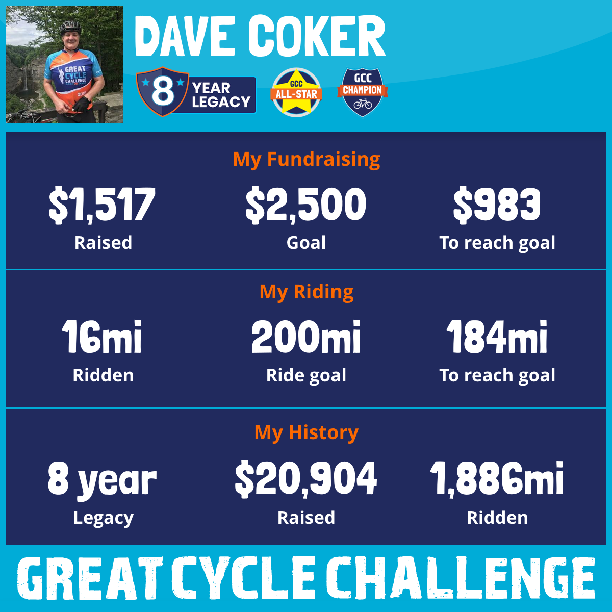 This is my 8th year and just like the last few years, this September 2025 I’m taking part in the Great Cycle Challenge to fight kids' cancer! This year I am going to push to 200 miles and we are going to stretch our financial goal a bit to $2500.