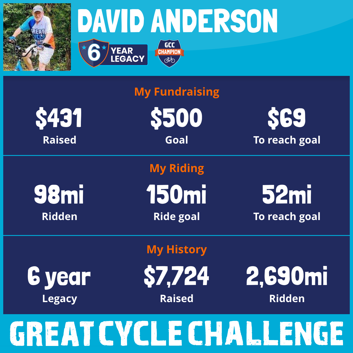 I am riding 150 mi in memory of Denver Anderson. Please sponsor me and support my challenge to fight kids' cancer and save little lives.