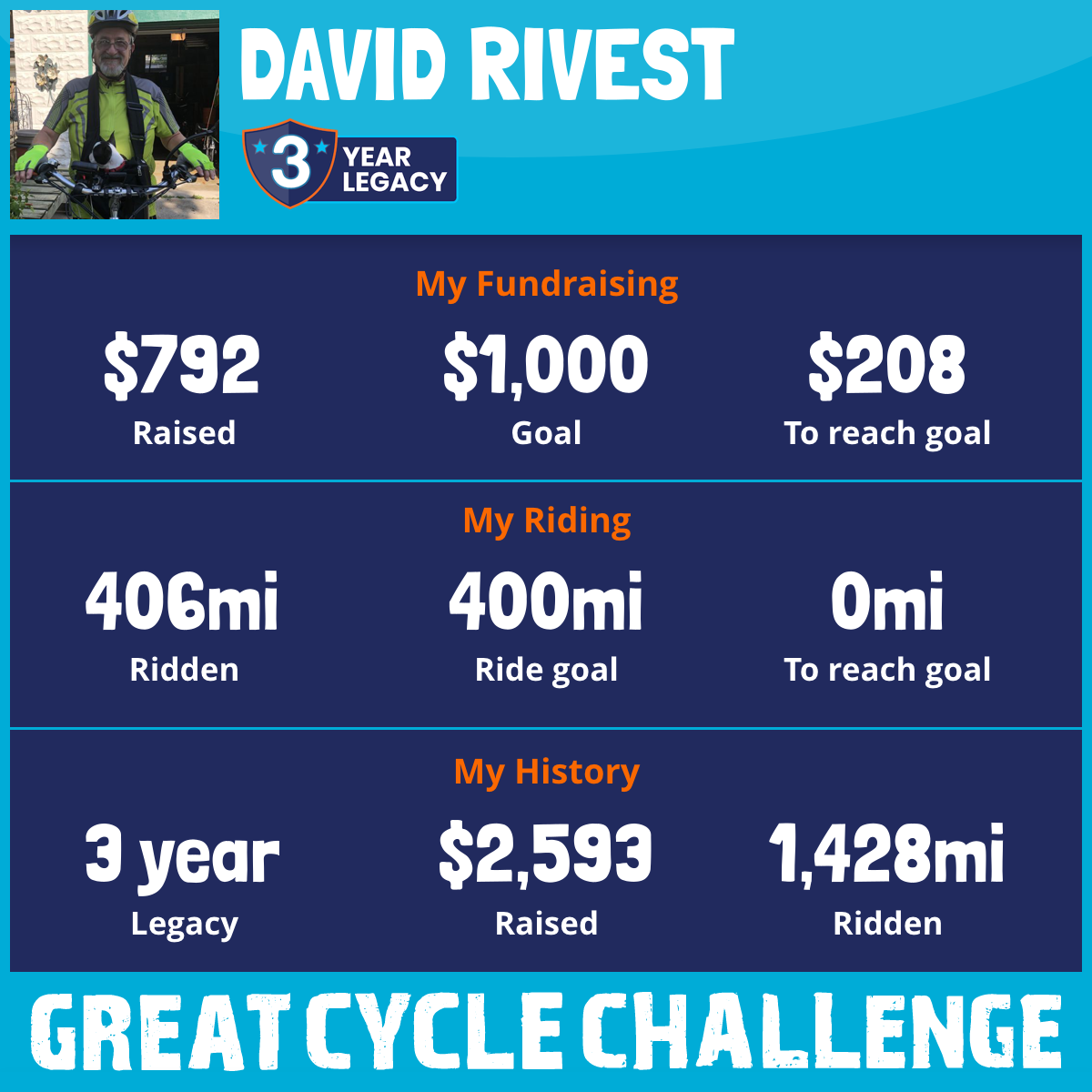 This September, I am once again, taking part in the Great Cycle Challenge to fight kids' cancer! This is my 3rd year participating in this challenge and my hope is to again meet (and exceed) my goals by riding 400 miles and raising $1000!