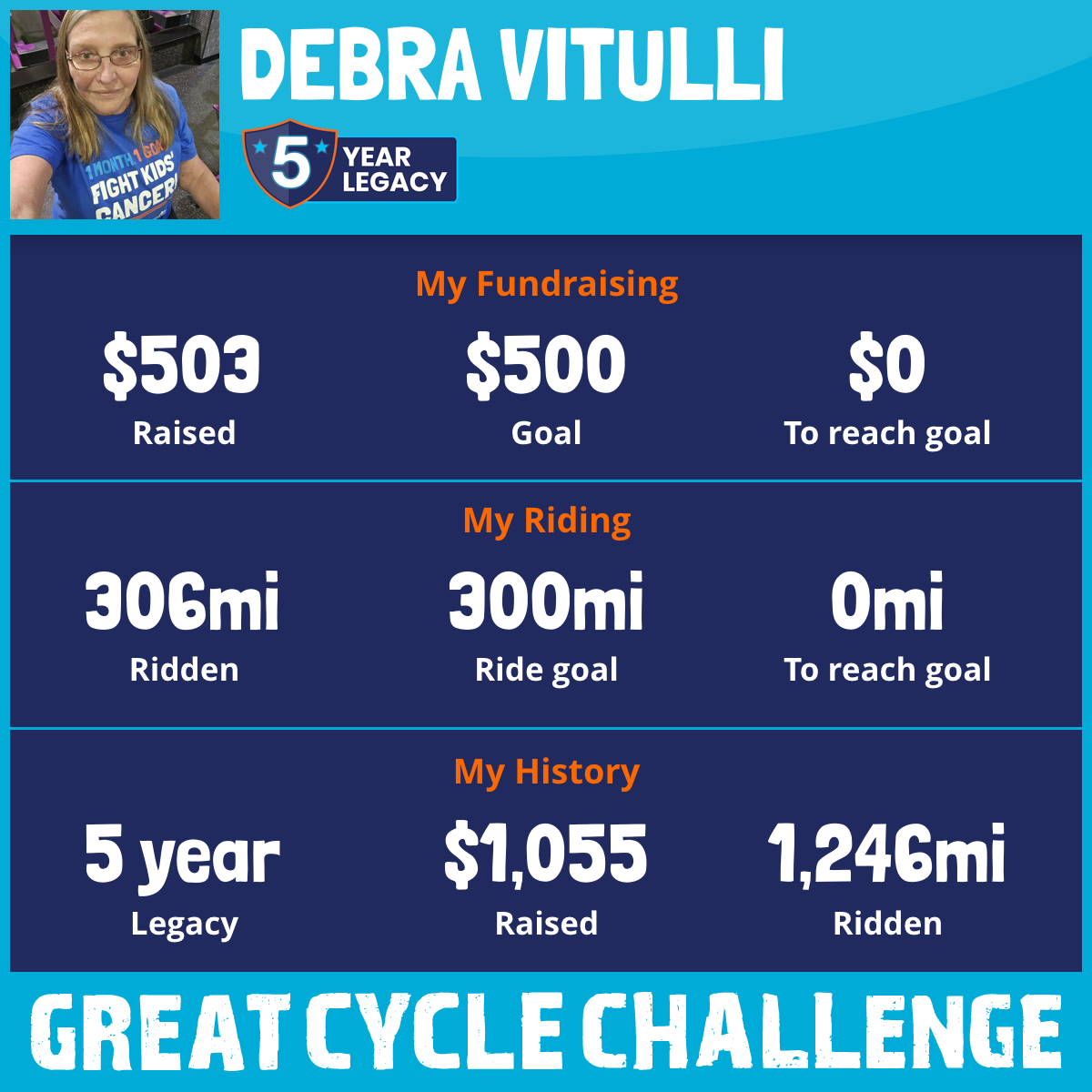 I am riding 300 mi in memory of Kids &adults fighting/fought for a cure. Please sponsor me and support my challenge to fight kids' cancer and save little lives.