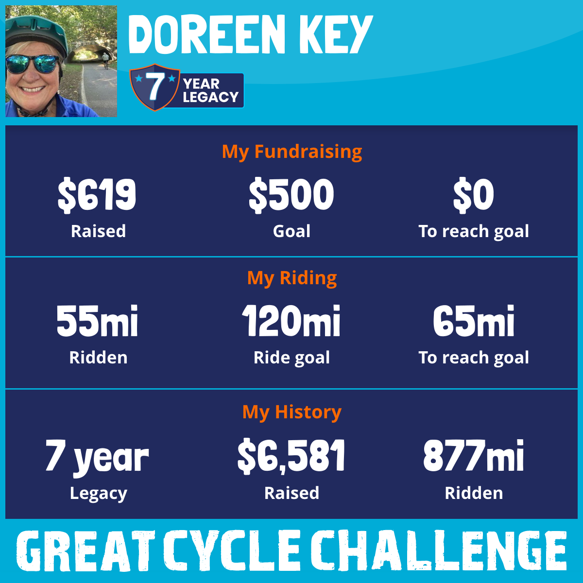 I'm riding in honor of my sister, Diane, who lost her battle with cancer in April, 2020. Not a day goes by that I don’t think of her and her bravery throughout those 9 years. We all miss her so much! ❤️