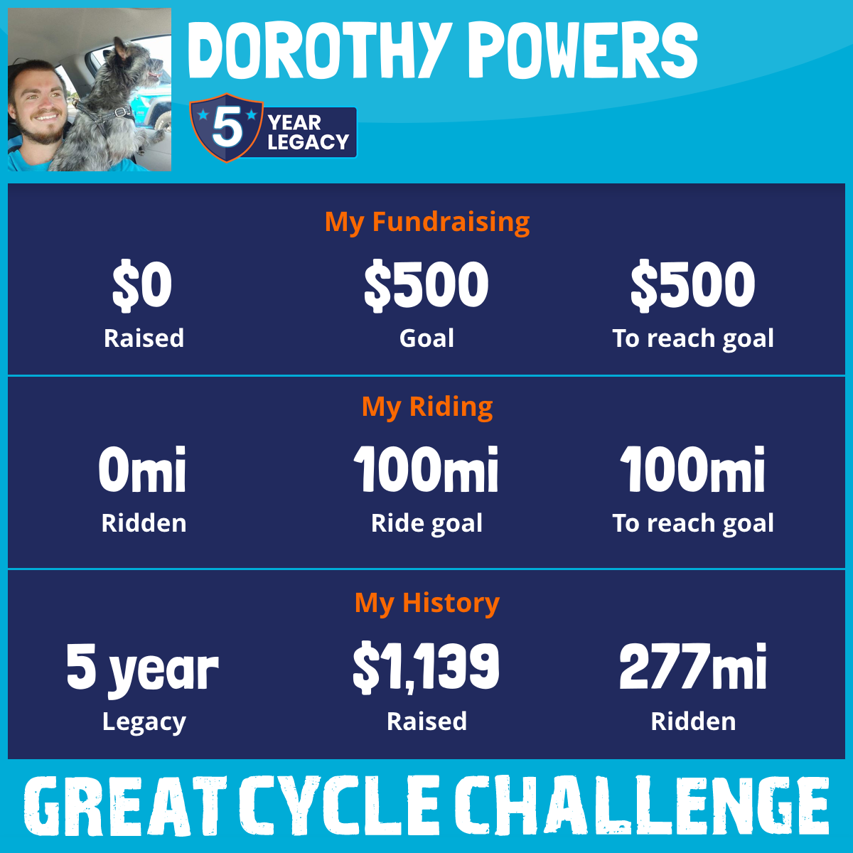 This September, My husband and I are taking part in the Great Cycle Challenge to fight kids' cancer! Why? As most of you know, our Son Tyler is a 2 time survivor and with organizations such as this we can help with raising awareness. Our son is one of the lucky ones, we know personally that is not always the case. Right now, cancer is the biggest killer of children from disease in the United States. Over 15,700 children are diagnosed every year, and sadly, 38 children die of cancer every week. Kids should be living life, not fighting for it. So I am raising funds through my challenge to help these kids and support Children’s Cancer Research Fund to allow them to continue their work to develop lifesaving treatments and find a cure for childhood cancer. Please support me by making a donation to give these kids the brighter futures they deserve. Your support will change little lives. Thank you. Dorothy