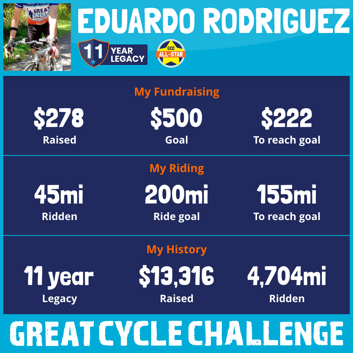 This year I am back on my bike and trying to ride as much as i can. The reason I take the challenge is because more American children lose their lives to cancer than any other disease - 38 kids die every week, I will set my miles goal to 250, but i will keep increasing if i can ride more and more.