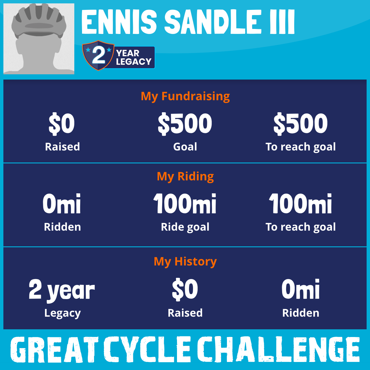 I am riding 100 mi in memory of my dad, Ennis Sandle Jr.. Please sponsor me and support my challenge to fight kids' cancer and save little lives.