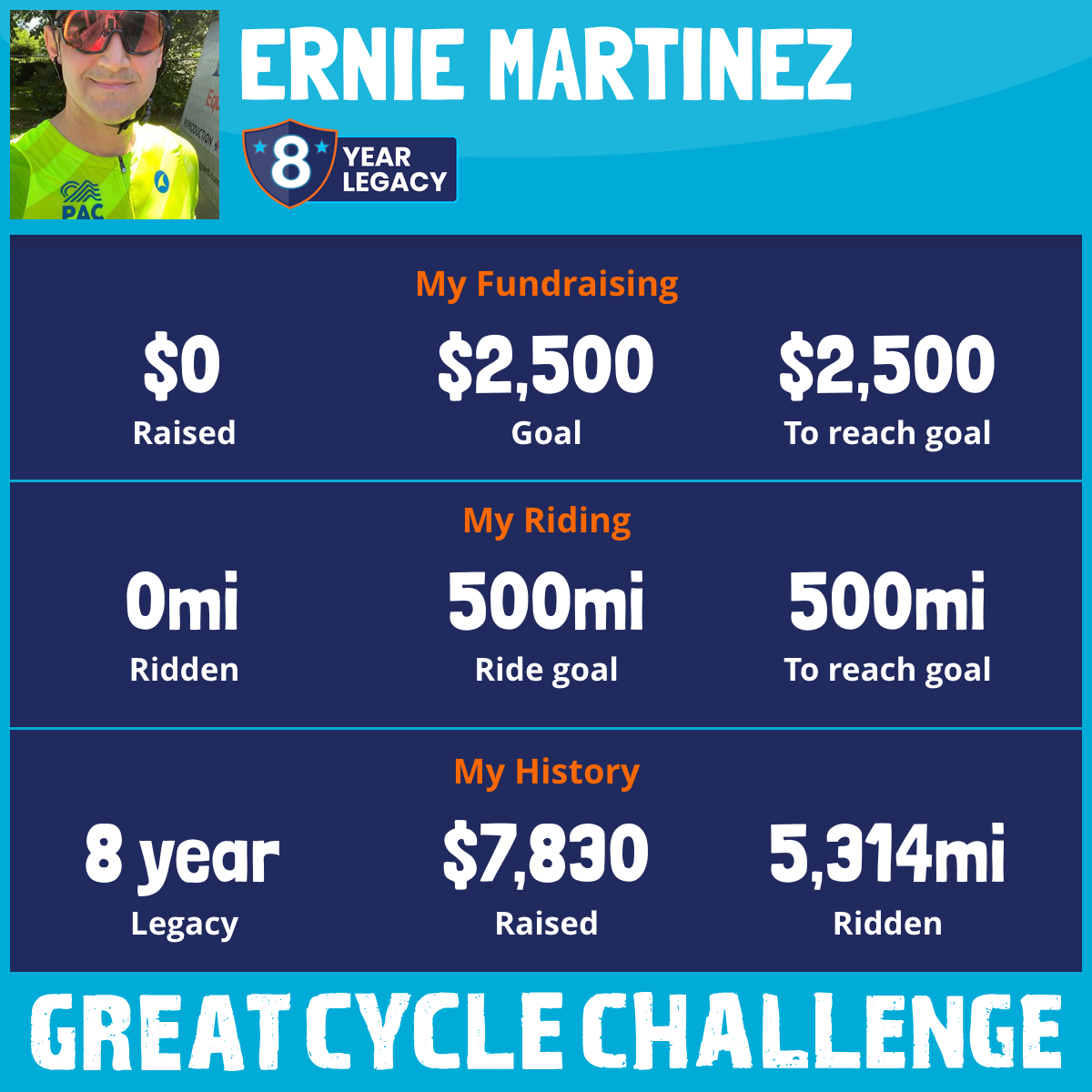 Help me reach my goal and even reach last years totals. I've pledged to ride 500 miles and raise $2500! WE CAN DO IT!!
