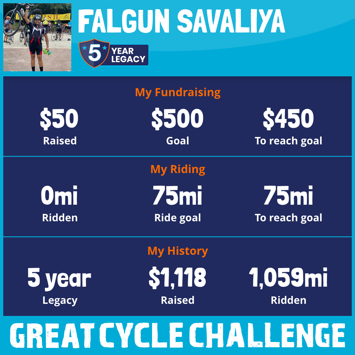I am riding 75 mi for Sudhir Patel. Please sponsor me and support my challenge to fight kids' cancer and save little lives.