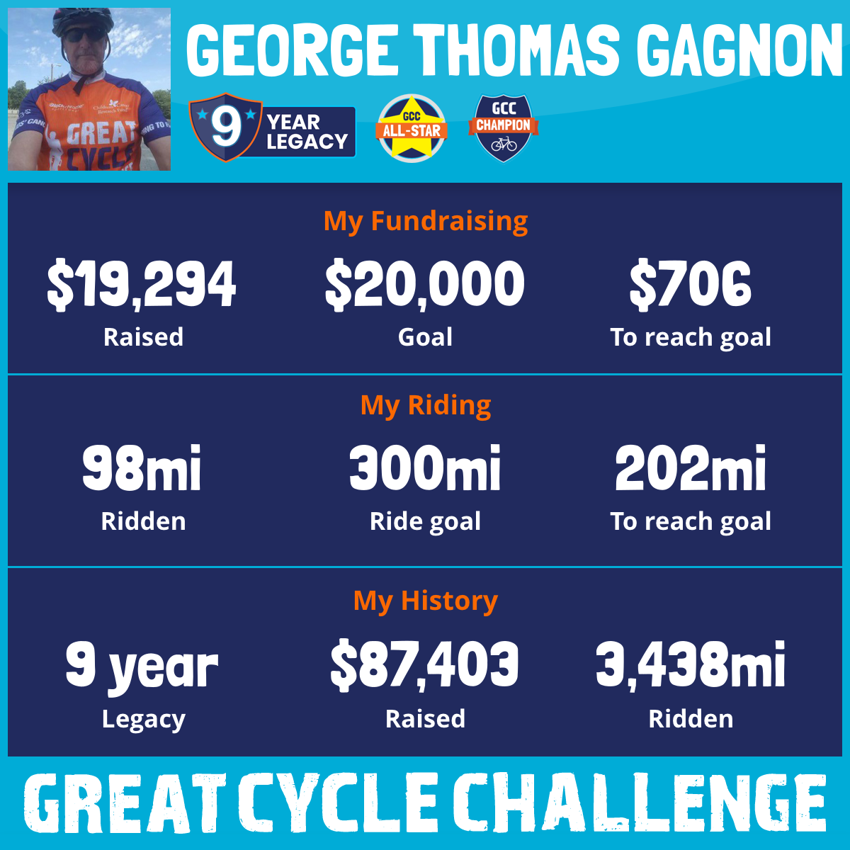 This September 2026, I am taking part in the Great Cycle Challenge to fight kids' cancer! This is my tenth-year riding and looking forward to having another successful fundraiser.