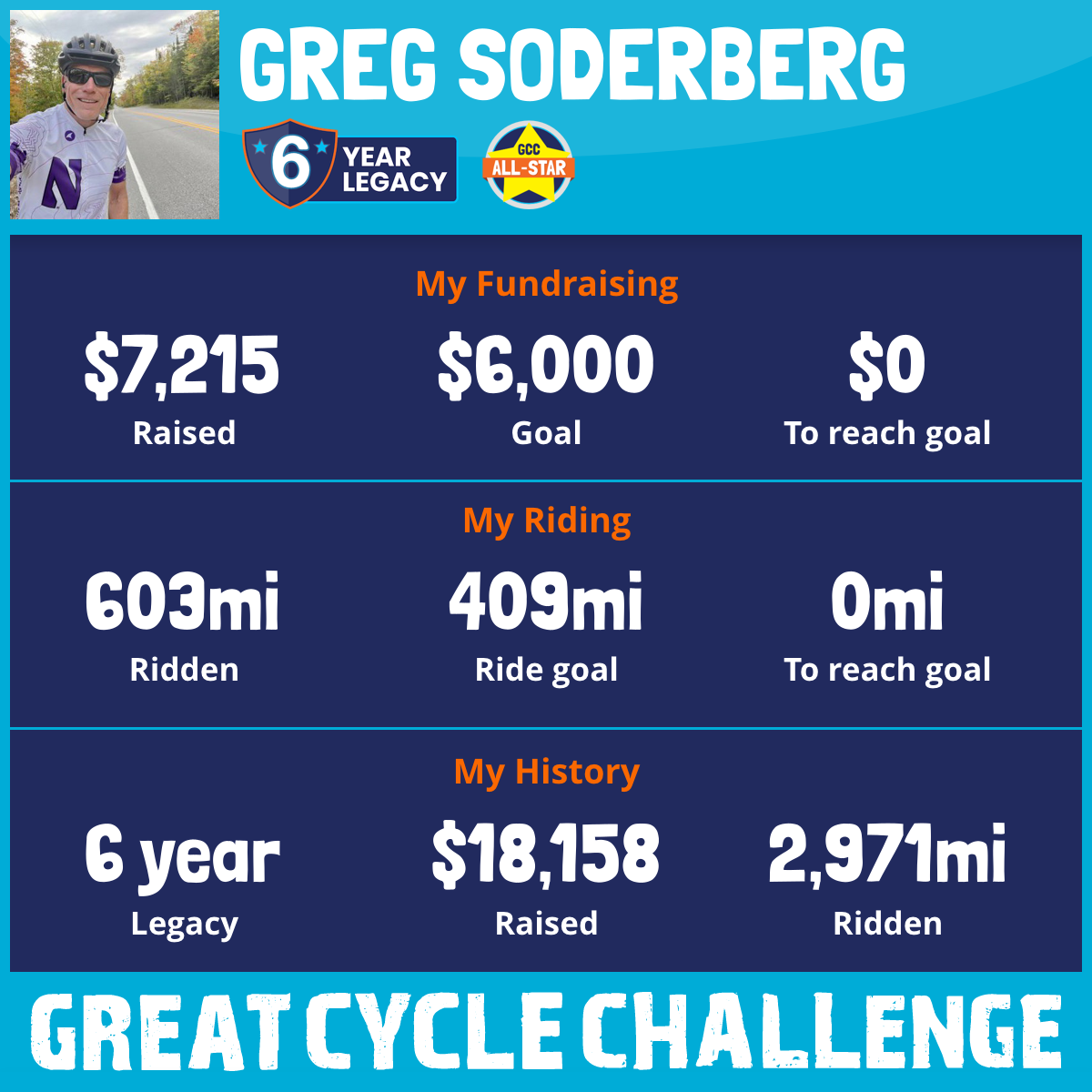 I am taking part in September's Great Cycle Challenge to fight kids' cancer! My goal is to ride 409 miles, the North to South length of Minnesota and am asking those who can - to donate to a great cause and/or keep those kids, care givers and researchers fighting cancer in your prayers. THANK YOU!