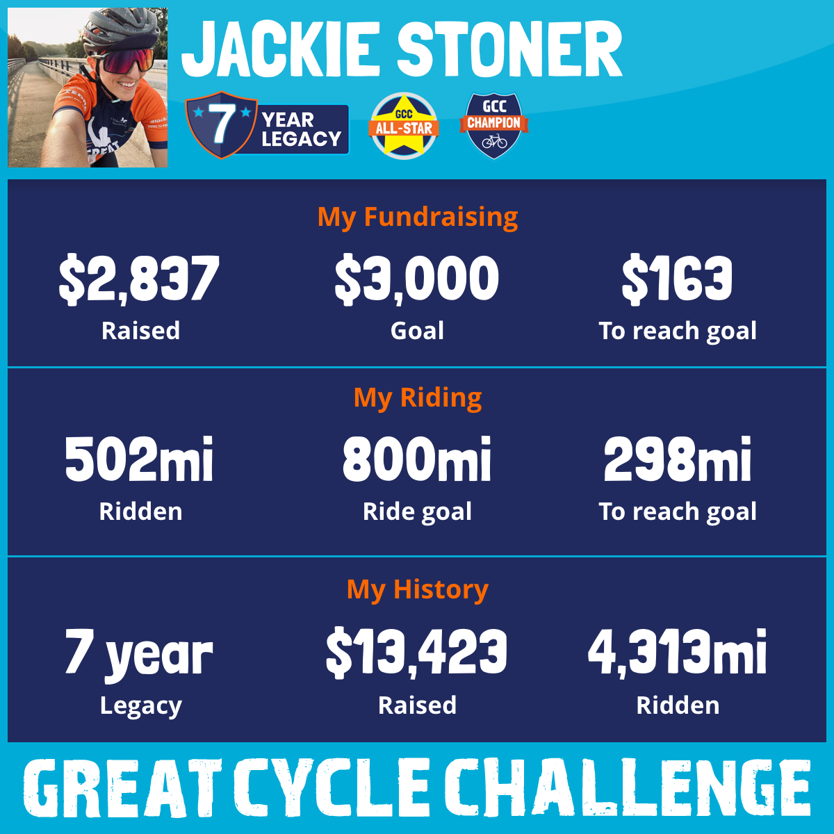 Cycling has and continues to be a defining activity in my life. I started riding a spin bike in my mid-late twenties at the local gym. Having an hour to myself while my kids were little was imperative to my mental and physical well-being. The first few years riding the Great Cycle Challenge were indoors training to teach spin classes with the Les Mills RPM program. Like a lot of folks when covid happened I was forced out of the gym. I remember going on a local group ride on my heavy commuter bike. I pushed so hard for 20 miles to stay with the group but often lagged behind everyone else. I scoured FB marketplace for an entry-level road bike, the same one pictured in my profile. I don't think I've stepped foot in a gym since that day.