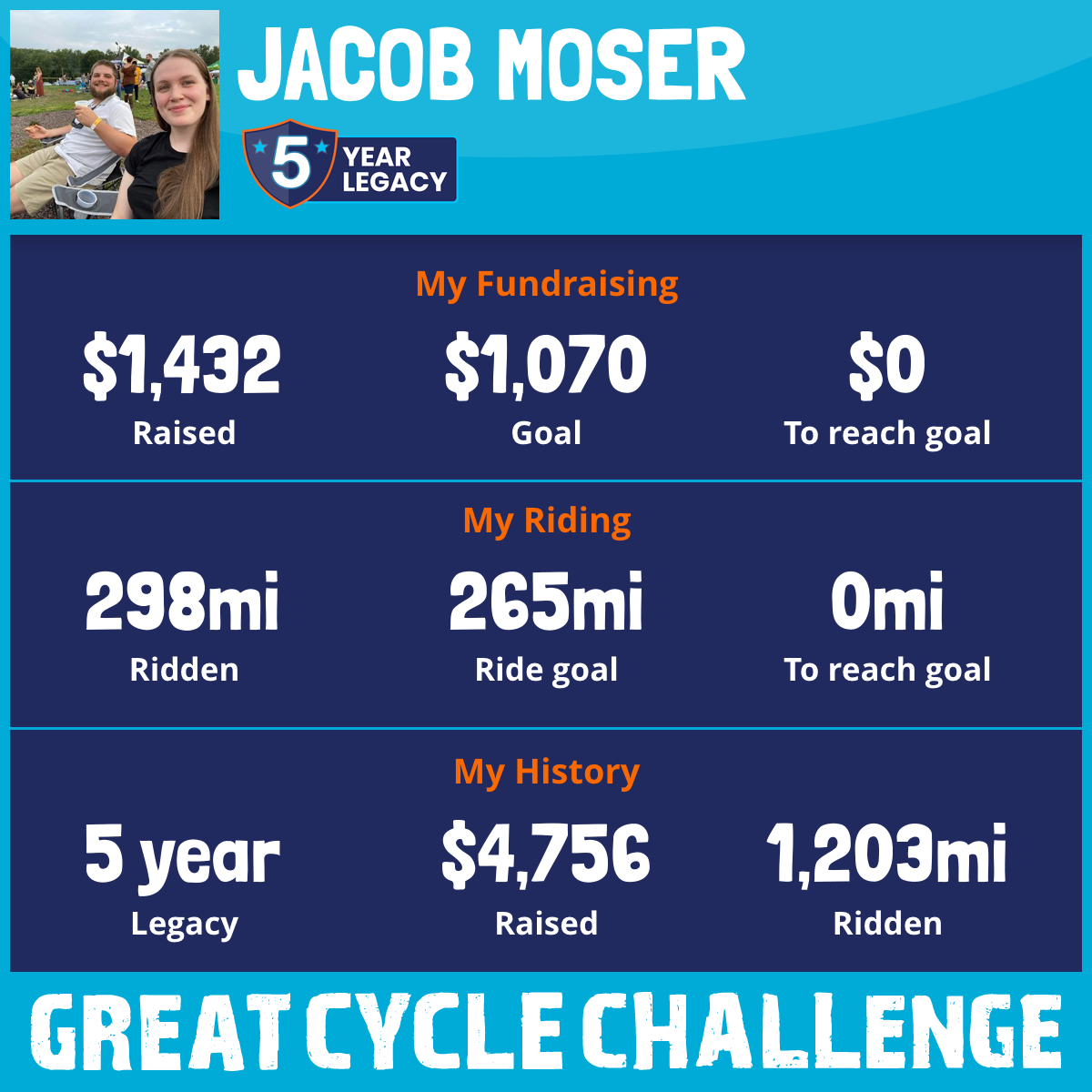 This year marks my 5th year riding in the Great Cycle Challenge to fight kids' cancer. My goal is to ride 265 miles and raise $1,070 — just one more mile and one more dollar than last year, because every small step forward matters in the fight against childhood cancer.