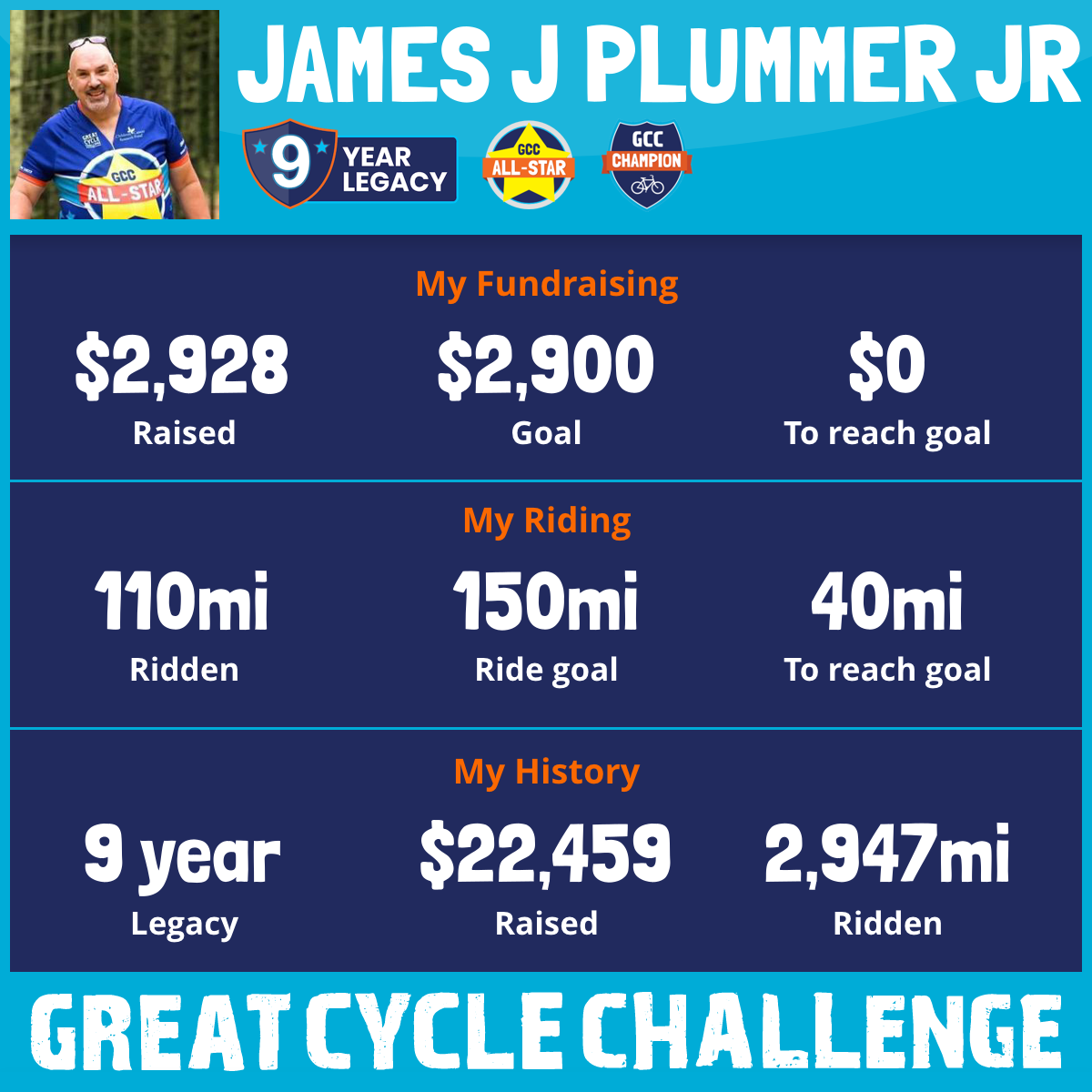 This year is my 9th year in taking part in the Great Cycle Challenge, last year I rode over 200 miles and raised over $3600. for Childhood Cancer research. This year so far my goals are to ride 200 miles and raise $4000 So far I have raised over $11,000 over the past 6 years. It's a long way till September, and I will be getting in a lot of riding in the next four months. I am riding for my Mother who went through Breast Cancer, and survived and my sister who is also a Cancer survivor.