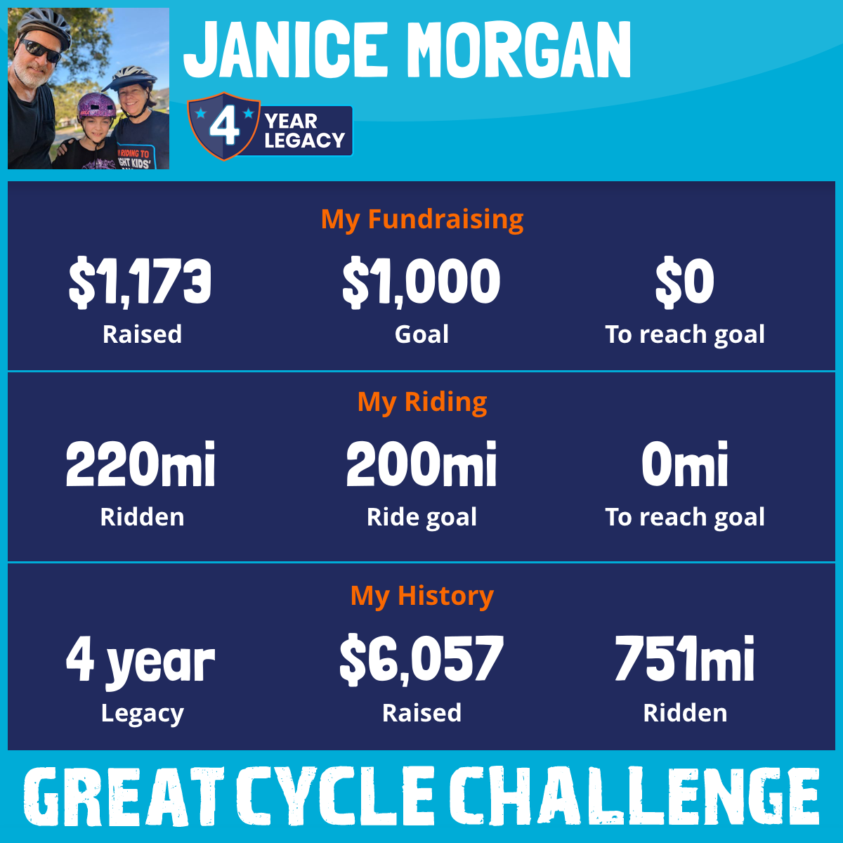 For this month of riding to be a success, I need you to support this effort by making a donation to give these kids the brighter futures they deserve. Just click the Donate Now button on my page (www.greatcyclechallenge.com/Riders/JaniceMorgan1 ) and follow the directions. Every dollar counts. If you prefer, you can give cash or checks to me and I can deposit your donation into the account and credit you on my page.