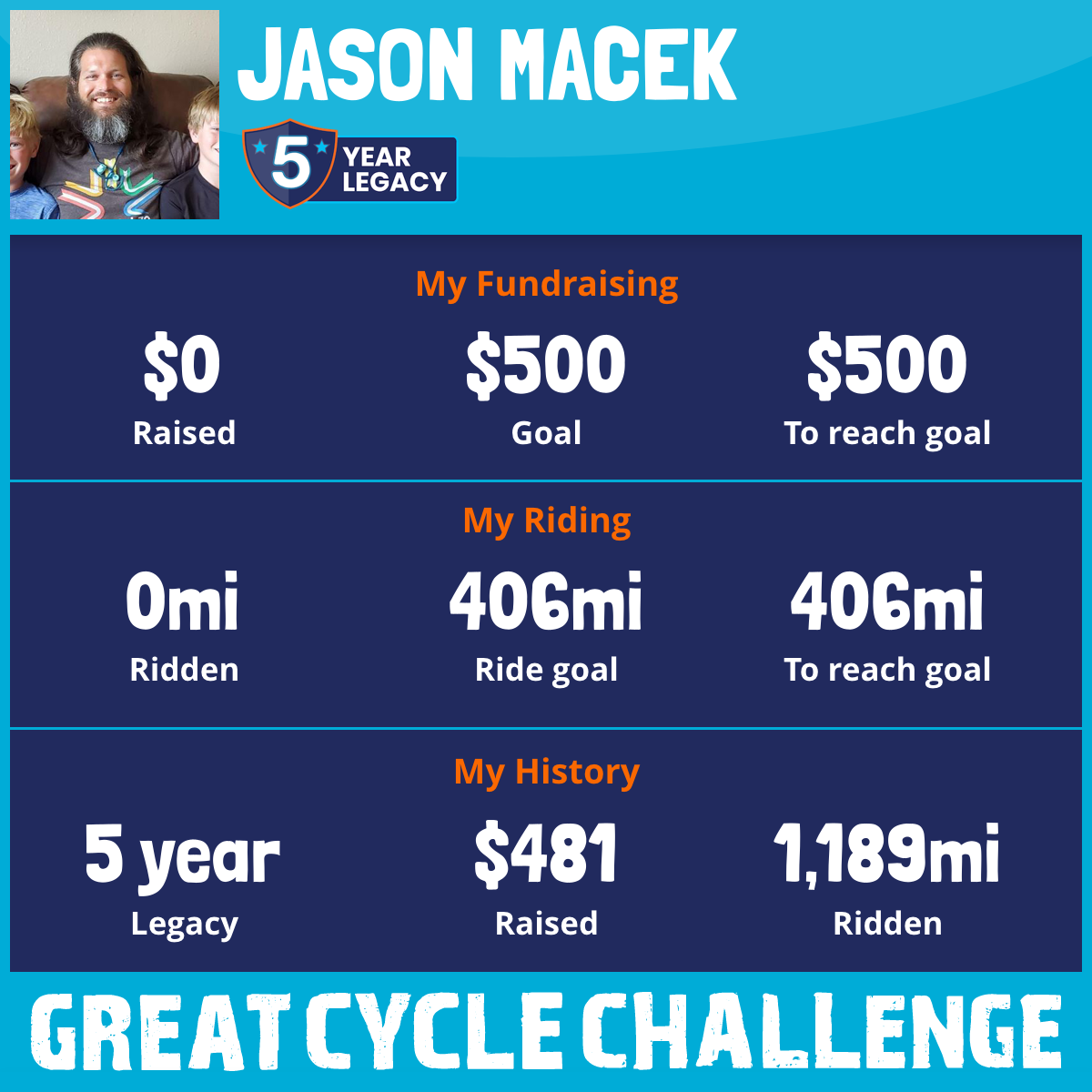 I am riding 406 mi in memory of Past, present, & future cancer victims/survivors. Please sponsor me and support my challenge to fight kids' cancer and save little lives.