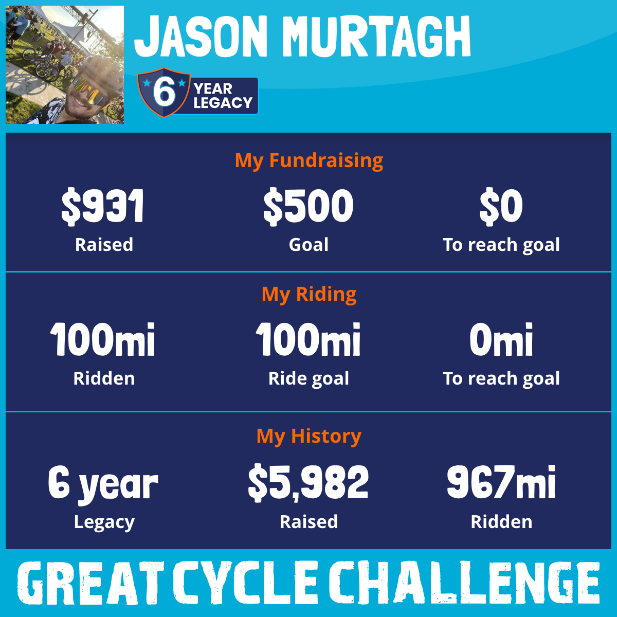 This is my 6th (!!!) year supporting this great cause. I have had incredible support from my family and friends for over half decade and I know this year will be no different. My goal this year is to raise $500 by riding 100 miles, but the more support I get the more I will ride. So, please share and lets make this my best year yet!!!