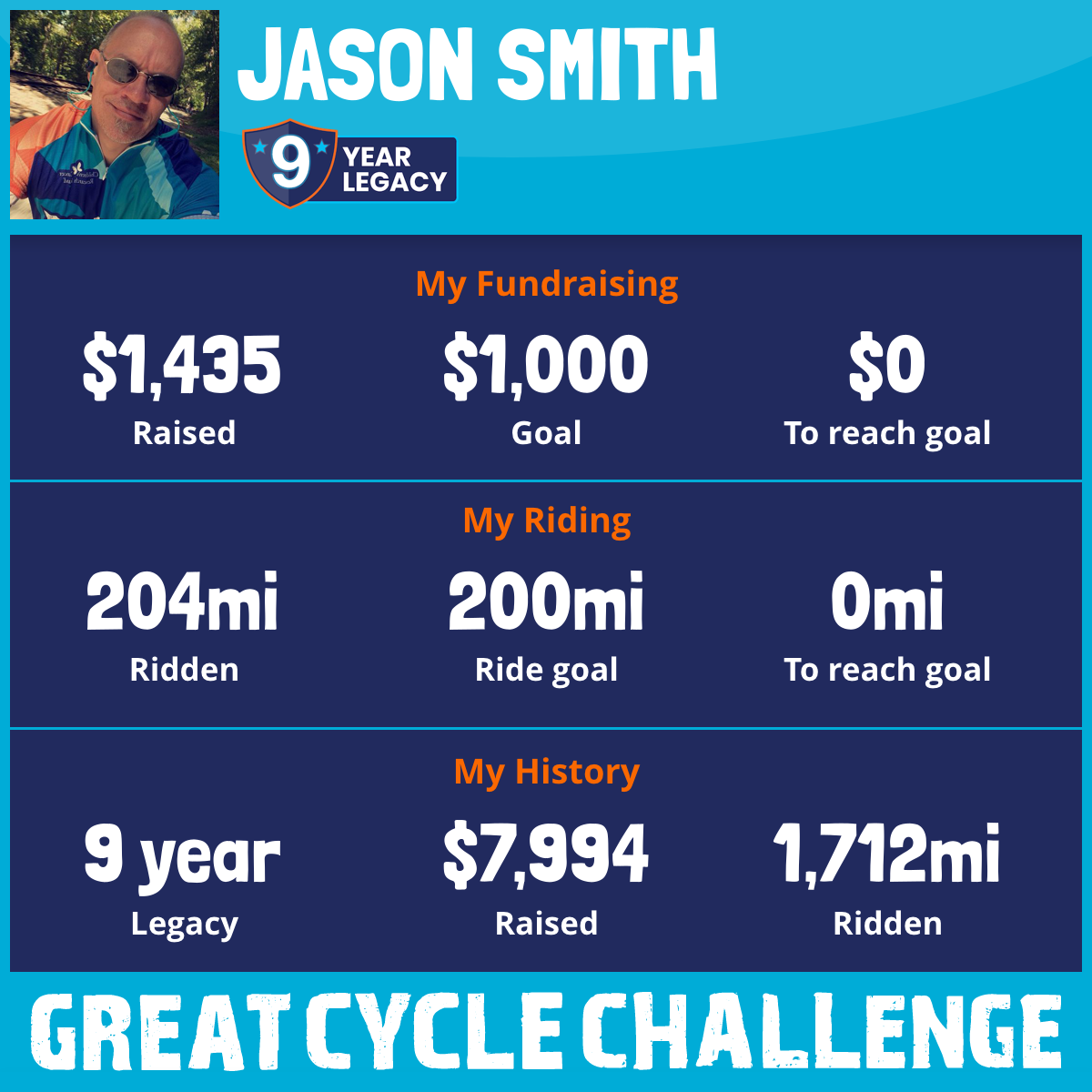Hello, I want to start by thanking everyone who has support me and this great charity over the past 8 years. I have been blessed with a healthy child and grandchildren and when I read about this cause 9 years ago I knew I had to help where ever I could for this group of wonderful children. I have lost family and friends to cancer and have also had survivors in my family and friends has shown me you can never stop fighting. Please join me on this ride as I earn some miles and donations to help all these amazing and wonderful children who fight everyday just wanting to be on their bikes too. Thank you for all your support. Jason