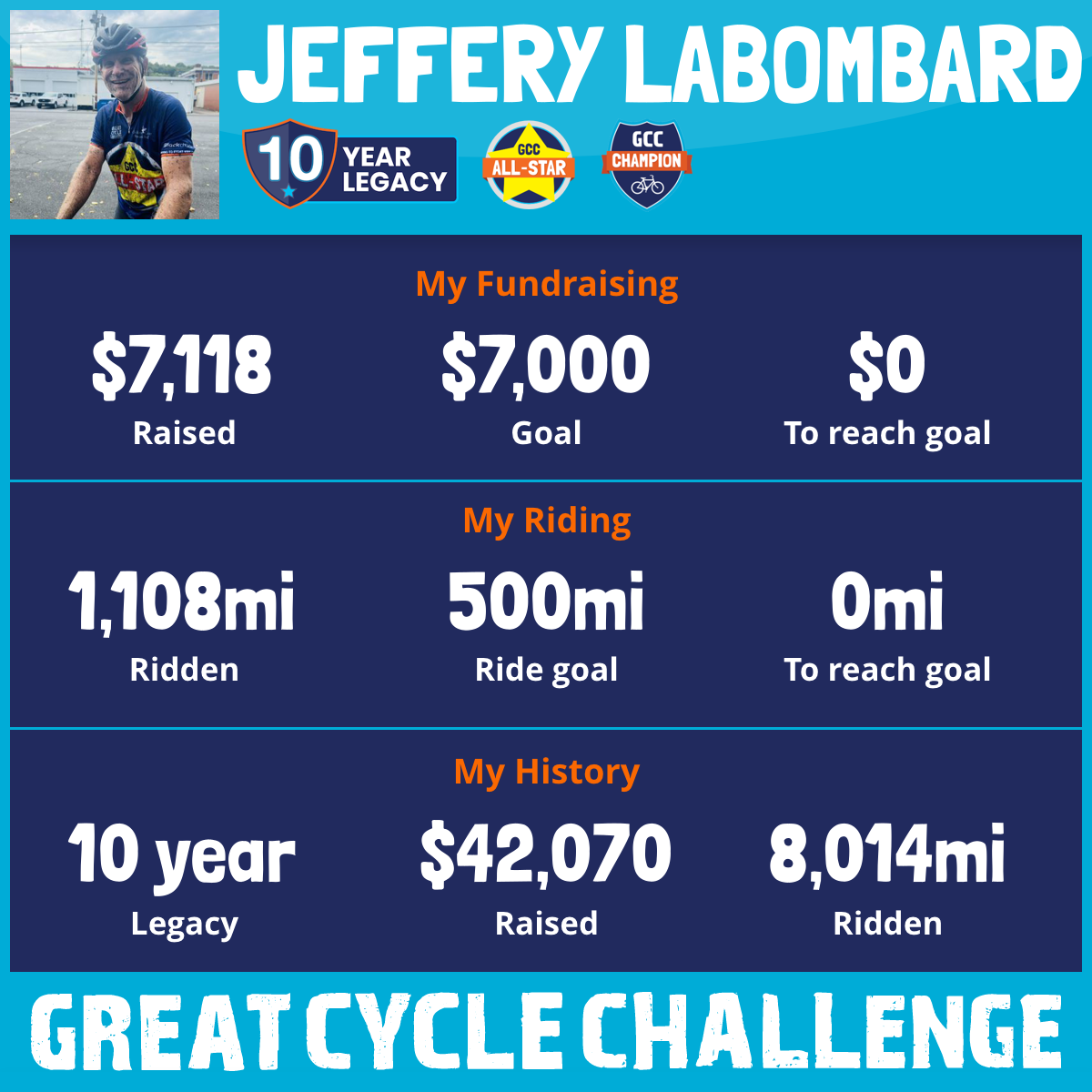 It has been another record setting year thanks to my terrific and generous family and friends. Seems we are able to set the bar higher each year in our efforts! My sincere appreciation goes out to all of you that are a part of the team to battle children's cancer and give them a chance to enjoy life!!! I am so very happy that all of you share my passion for supporting this wonderful cause!!! As long as I can turn my pedals, I will be an active participant, and your support certainly gives me the fire I need to forge ahead!