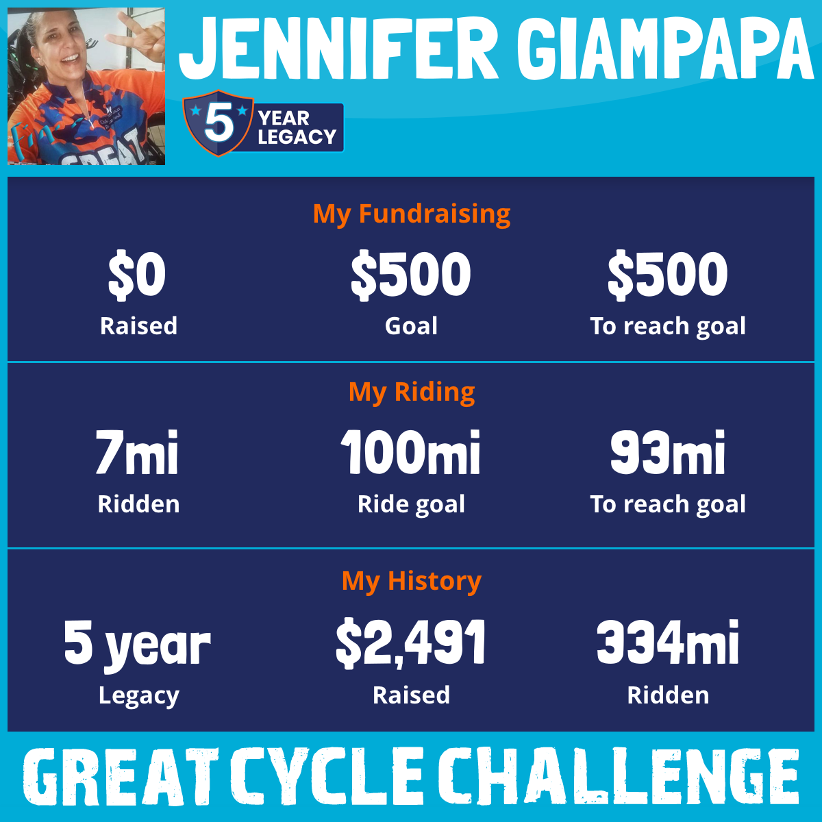 I am riding 100 mi in memory of My Brother, James Giampapa. Please sponsor me and support my challenge to fight kids' cancer and save little lives.