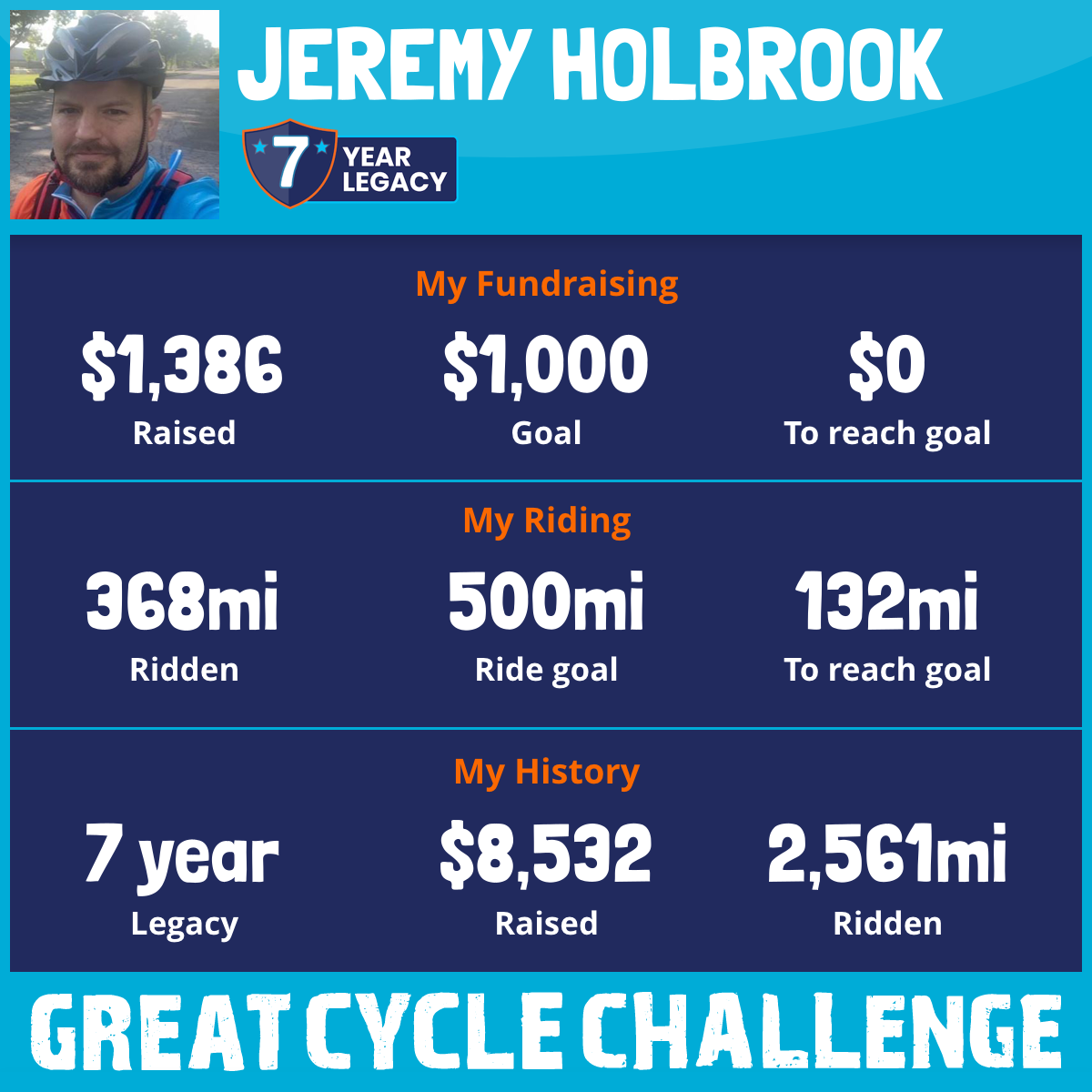 My wife was diagnosed with breast cancer in 2020. She has been through surgery and chemo and now has a clean bill of health. We appreciate everyone's thoughts and prayers and are so thankful she is doing well. I am starting my 7th year riding to support her, my grandmother and all those that are or have been struggling with a cancer diagnosis.