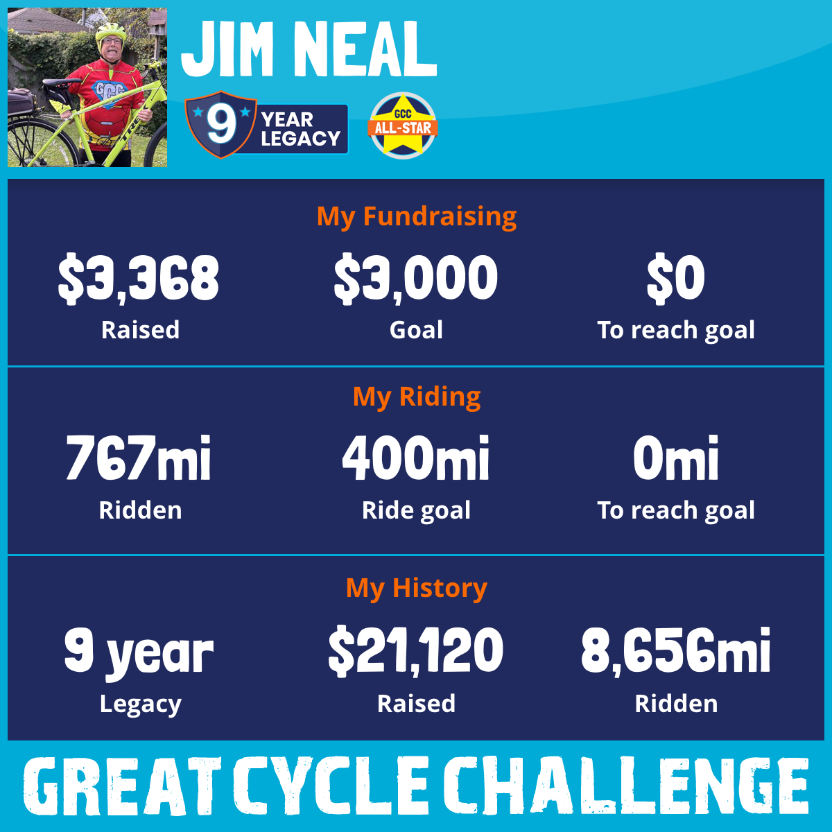 This September, I am taking part in the Great Cycle Challenge to fight kids' cancer! My wife has been fighting MGRS for over a year. The battle is endless and keeping our chins up is challenging. Janet has been a trouper. I’m proud of her strength and determination. Knowing the struggle first hand, I want to dedicate my rides to my wife, Janet.