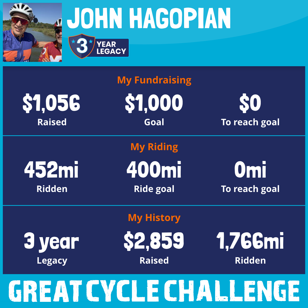 Last year I rode 650 miles and we raised $1246. Unfortunately, I can't commit to that level again because I over taxed my hip replacement and took several months to rehabilitate it. So I am lowering my goal to 200 miles and see where it goes from there.