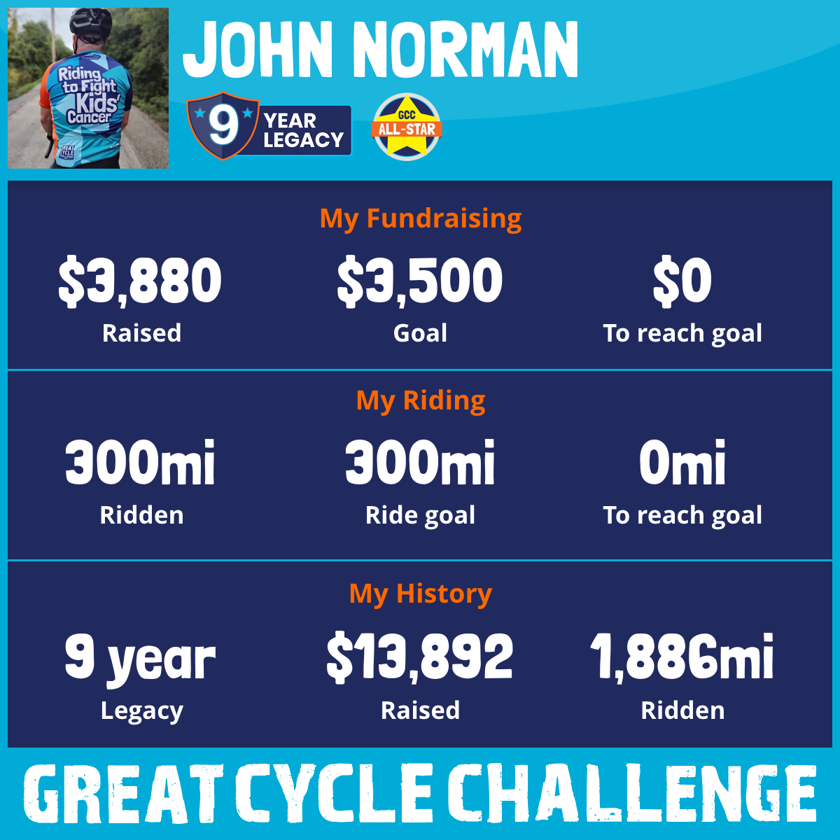I choose to do one fundraiser a year. 2026 will be my 10th year participating in the Great Cycle Challenge and will be riding this September to fight kids' cancer! My goal is to pedal 300 miles throughout the month.