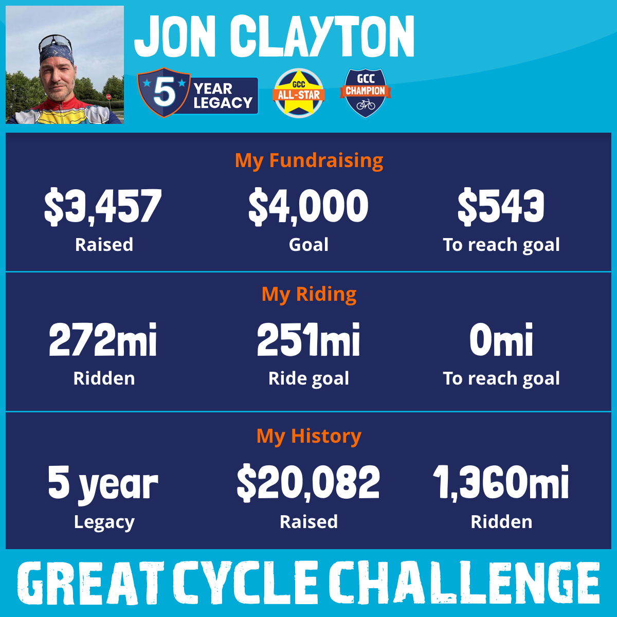 This September, for my fourth year, I will be riding with the Great Cycle Challenge to fight kids' cancer! This campaign has raised over $72 Million Dollars since its inception in 2017. Last year we raised over $9 Million! Each year thousands of riders sign up to pedal and petition their friends, family, and network to support this worthy cause. I am proud to be part of the GCC Champions.