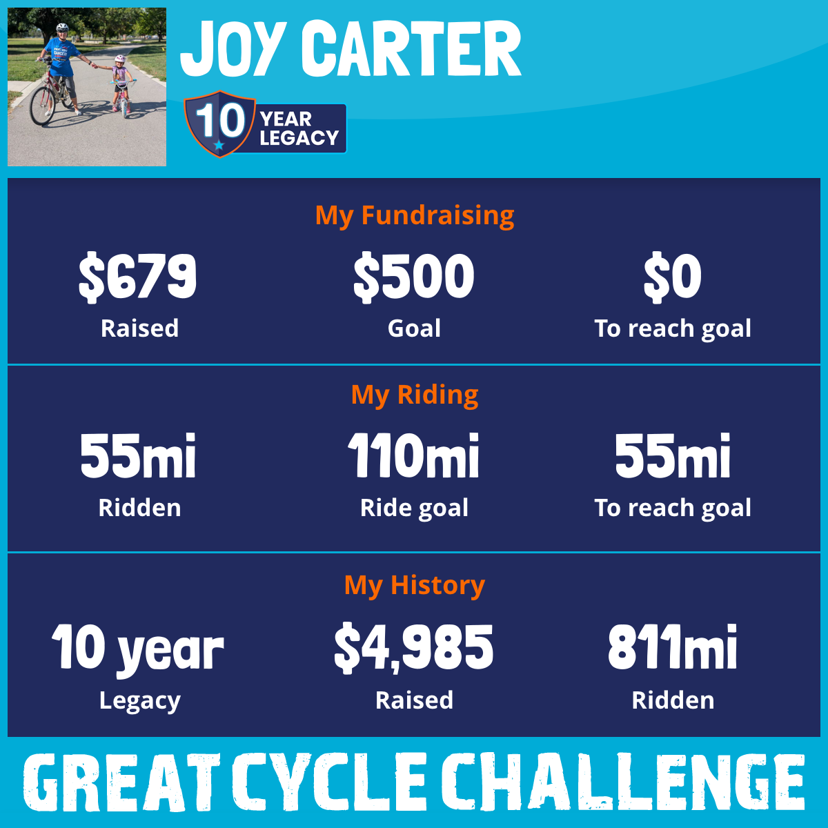 My goal this year is to ride 110 miles and raise $500. I love riding my bike and listening to praise music while doing so.